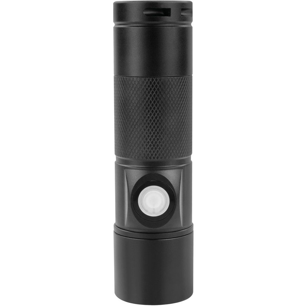 2 Leuchtstärken · Dimm-Funktion · Blitzlicht-Funktion · Integrierter USB-Stecker für direktes Laden an handelsüblicher USB-Buchse · Stufenloses Fokussierungssystem · Seitlicher Schalter · Cree-LED verbaut · Griffige Oberfläche · Robustes Aluminium-Gehäuse · Staub- und spritzwassergeschützt · Präzisionsreflektor · Stoßfestigkeit durch 1 m Fallhöhe getestet · Geringer Energieverbrauch und minimale Hitzeentwicklung · LED-Kapazitätsanzeige