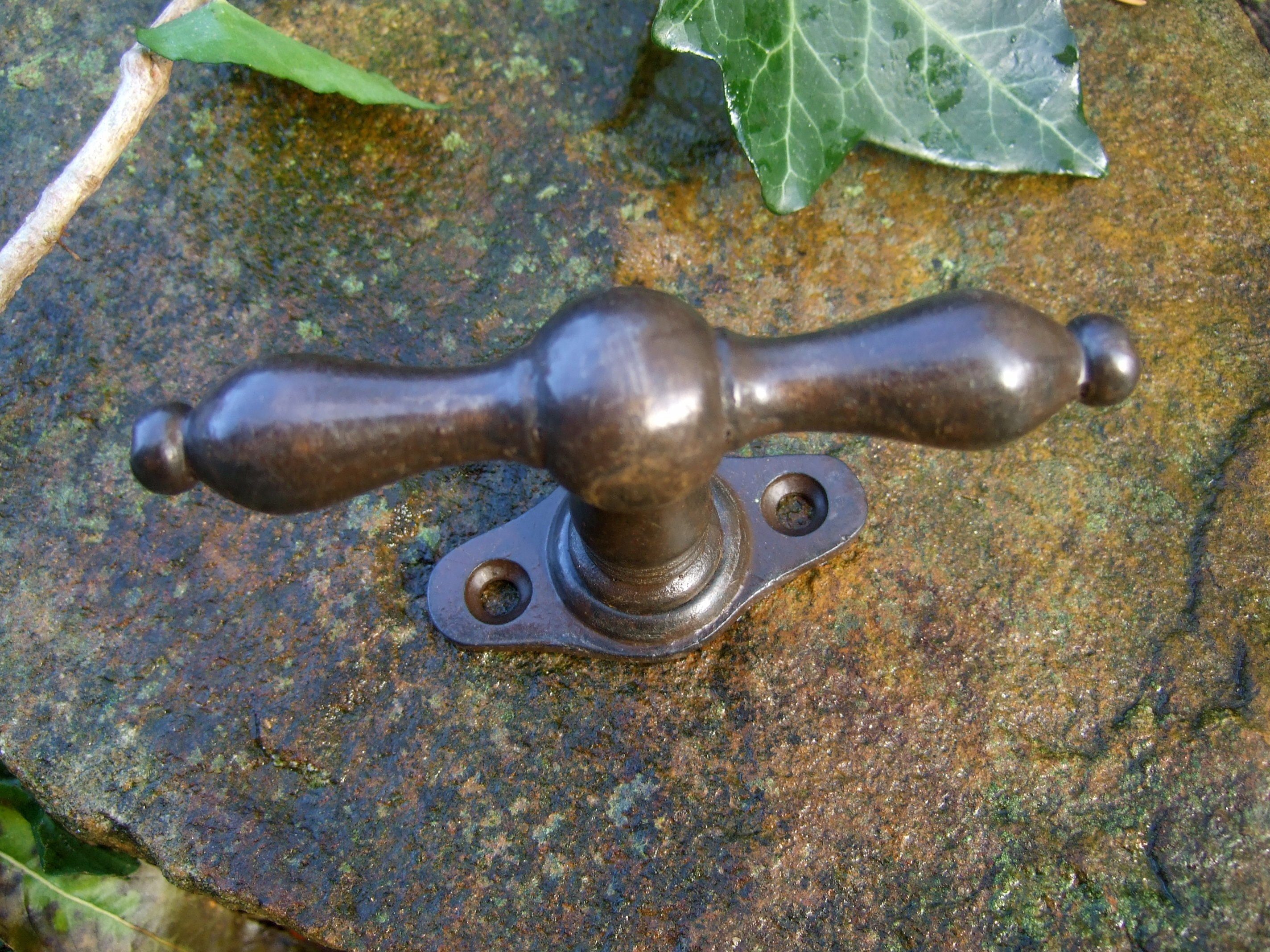 Lieferumfang: 1 Fensterbeschlag aus Antik-Eisen mit passenden M5-Schrauben und Dorn/Vierkant zur Montage