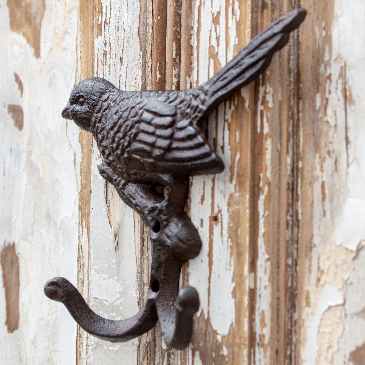 Dieser schön designte doppel Kleiderhaken aus braun lackiertem Gusseisen mit einem schönen Motiv eines Vogels eignet sich sehr gut als Flurgarderobe. Er ist wunderschön verziert und ansprechend individuell geformt. Auch als Garderobe für ihre Kinder ist er bestens geeignet.