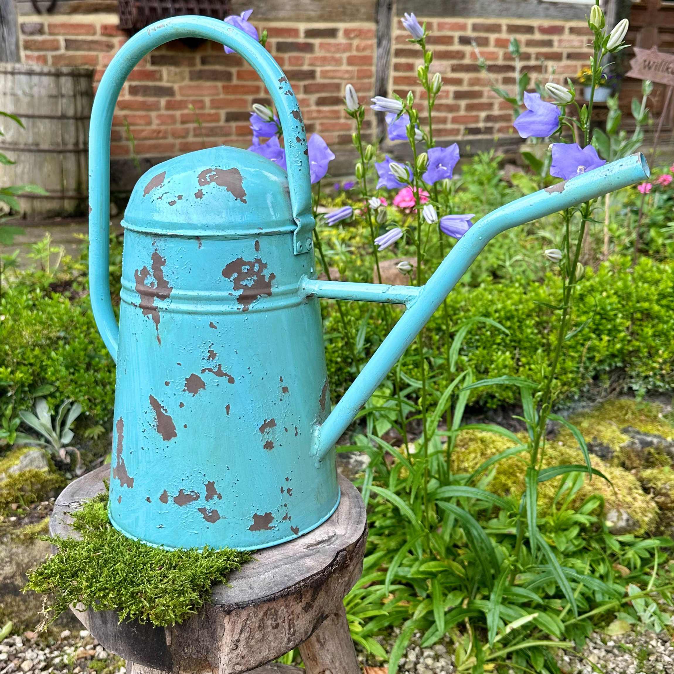 Durch das Zusammenspiel von türkisem Blech und braunen Roststellen wirkt sie sehr antik und dekorativ. Sehr schön als Eyecatcher in einem Wintergarten oder im Schrebergarten.