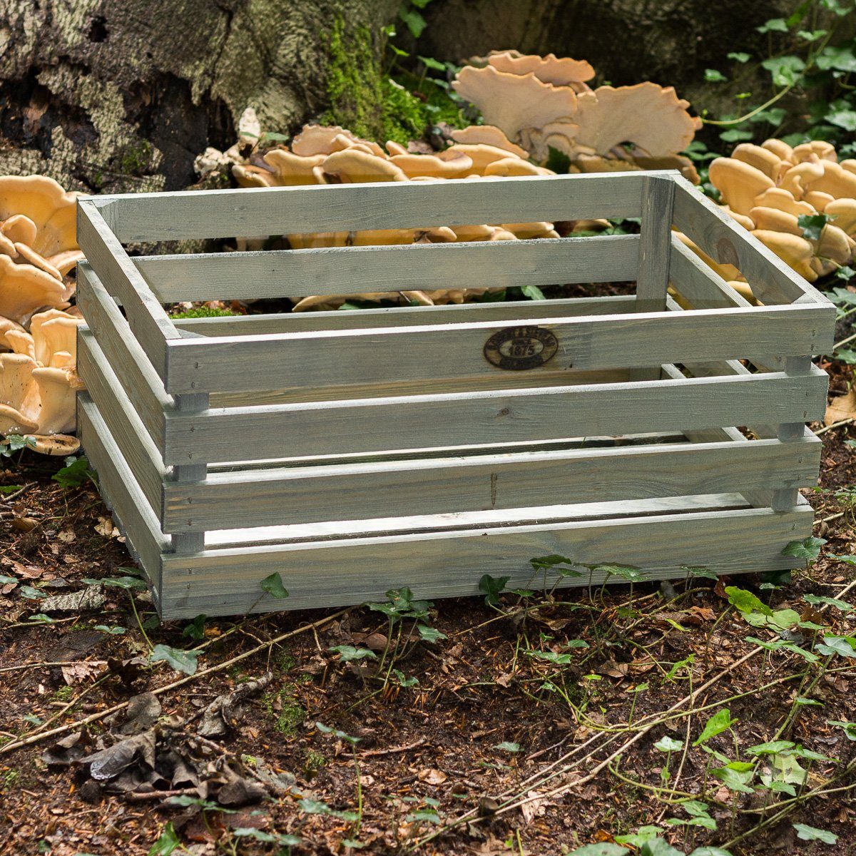 Eine attraktive, rustikale Obstkiste im „Natural-Used-Look“. Durch ein eingebranntes Logo mit der Jahreszahl „1875“ wirkt diese prachtvolle, grau lasierte Kiste äußerst nostalgisch.