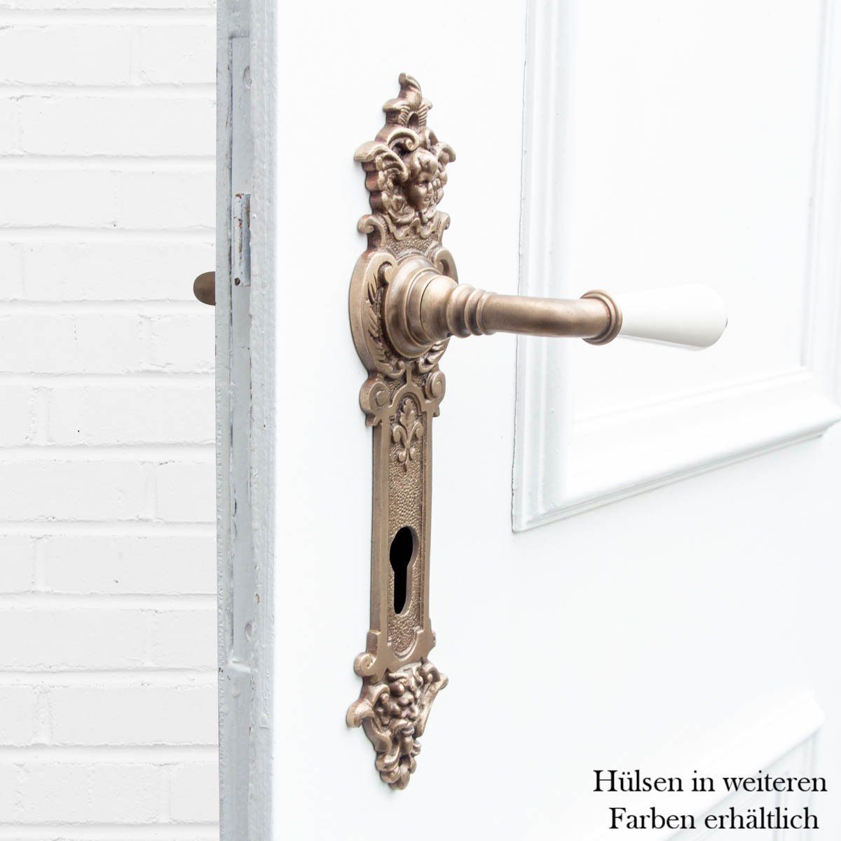 Eine Historismus Drückergarnitur in Messing patiniert wie aus der Zeit vor der Jahrhundertwende. Die hochwertigen Klinken sind mit Porzellangriffen in tiefschwarz bestückt und ergänzen die Haustür Schlossabdeckung PZ 92 sehr gut.