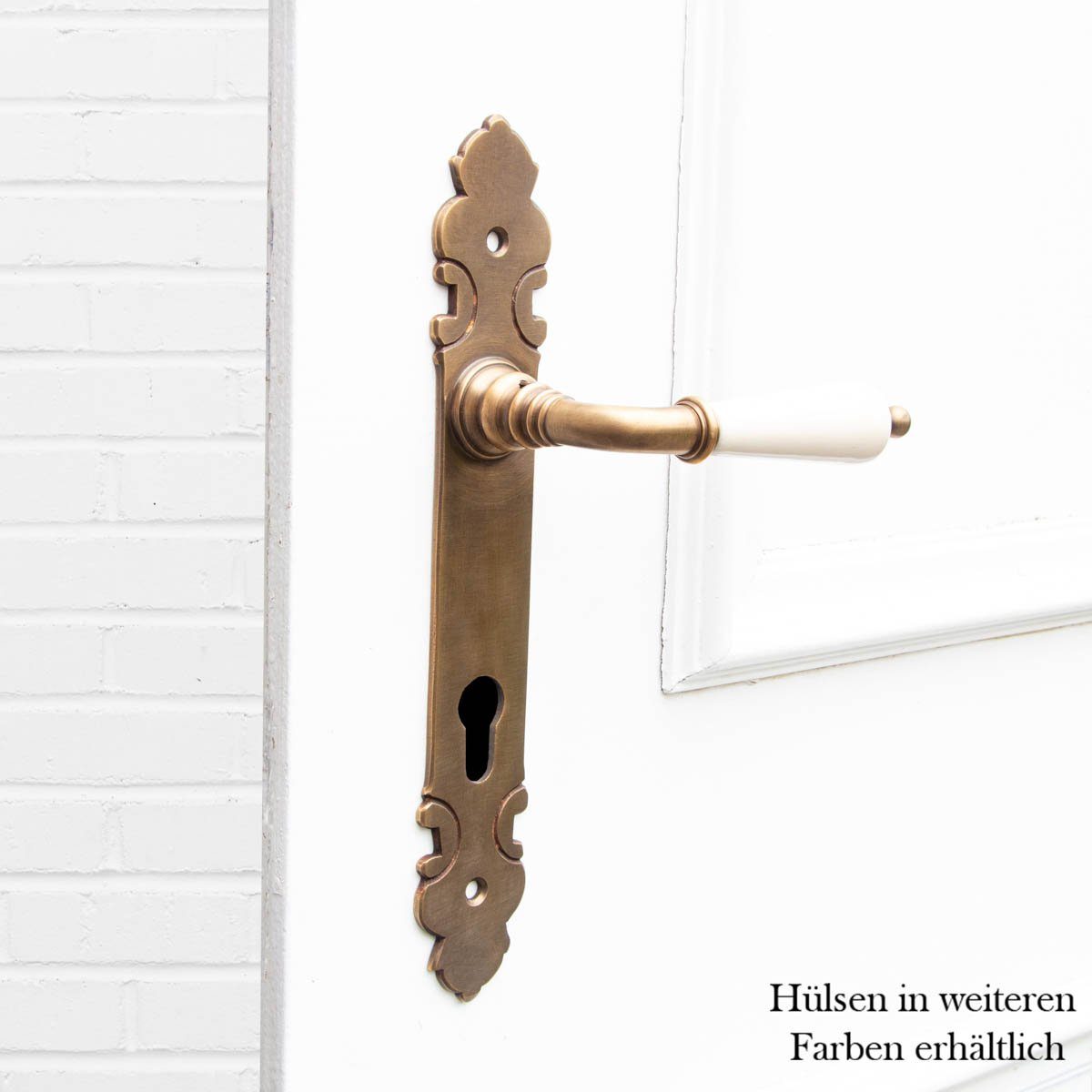 Lieferumfang: 1 Set Türbeschläge, Messing patiniert mit Keramikgriff altweiß, inkl. Dorn 8 mm x 8 mm x 10 cm, lang