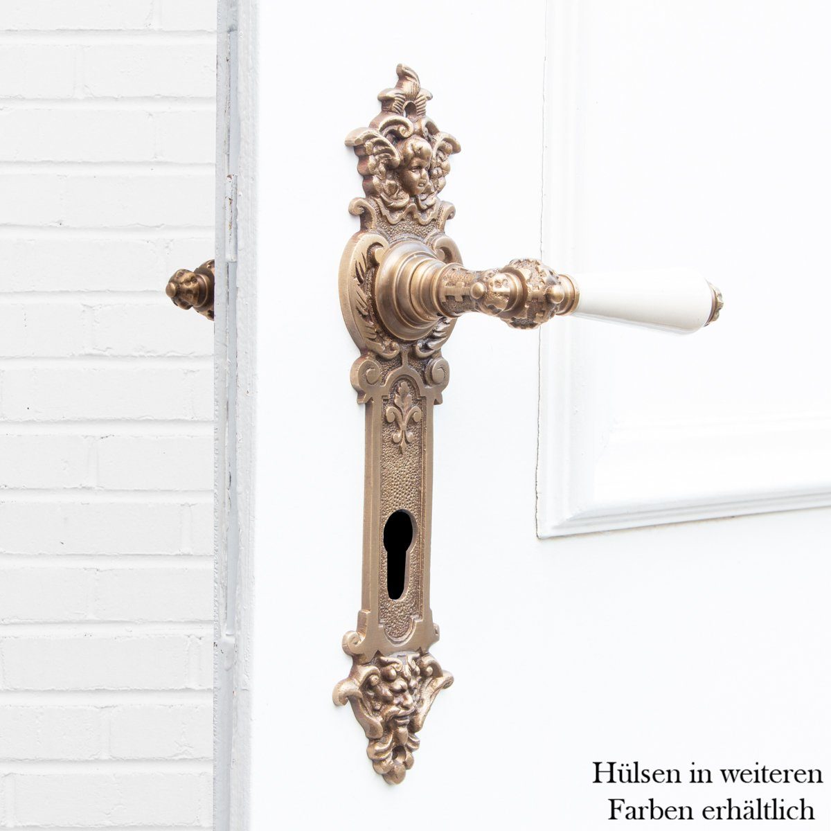 Lieferumfang: 1 Haustür Langschild Drückergarnitur mit Porzellangriffen, bestehend aus 2 Türklinken "Kiew", 2 Langschildern „Engel“ für die Haustür (PZ92), Messing patiniert, Klinkengriffe in antikweiß
