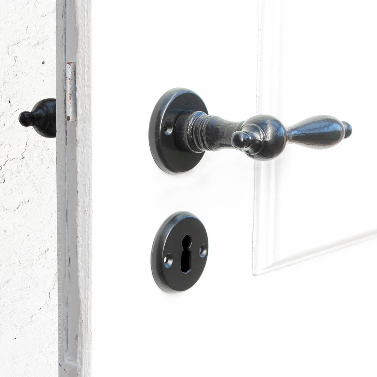 Die klassisch gestaltete Rosetten-Garnitur besteht aus Türklinken aus schwarzem Gusseisen und schlicht gearbeiteten Rosetten. Sie sieht sowohl auf historischen, wie auch modernen Zimmertüren toll aus.