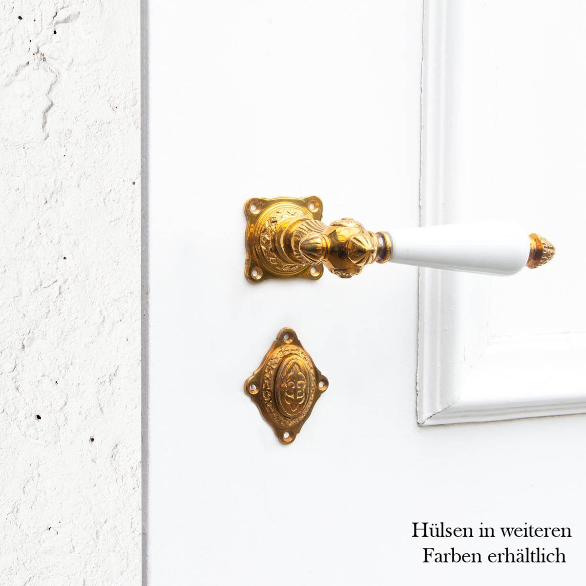 Lieferumfang: 1 Drückergarnitur für Innentüren, best. aus 2 Klinken + 2 Klinken-Rosetten + 2 Schlüsselloch-Rosetten + Dorn Material: Messing poliert mit Porzellangriffen weiß
