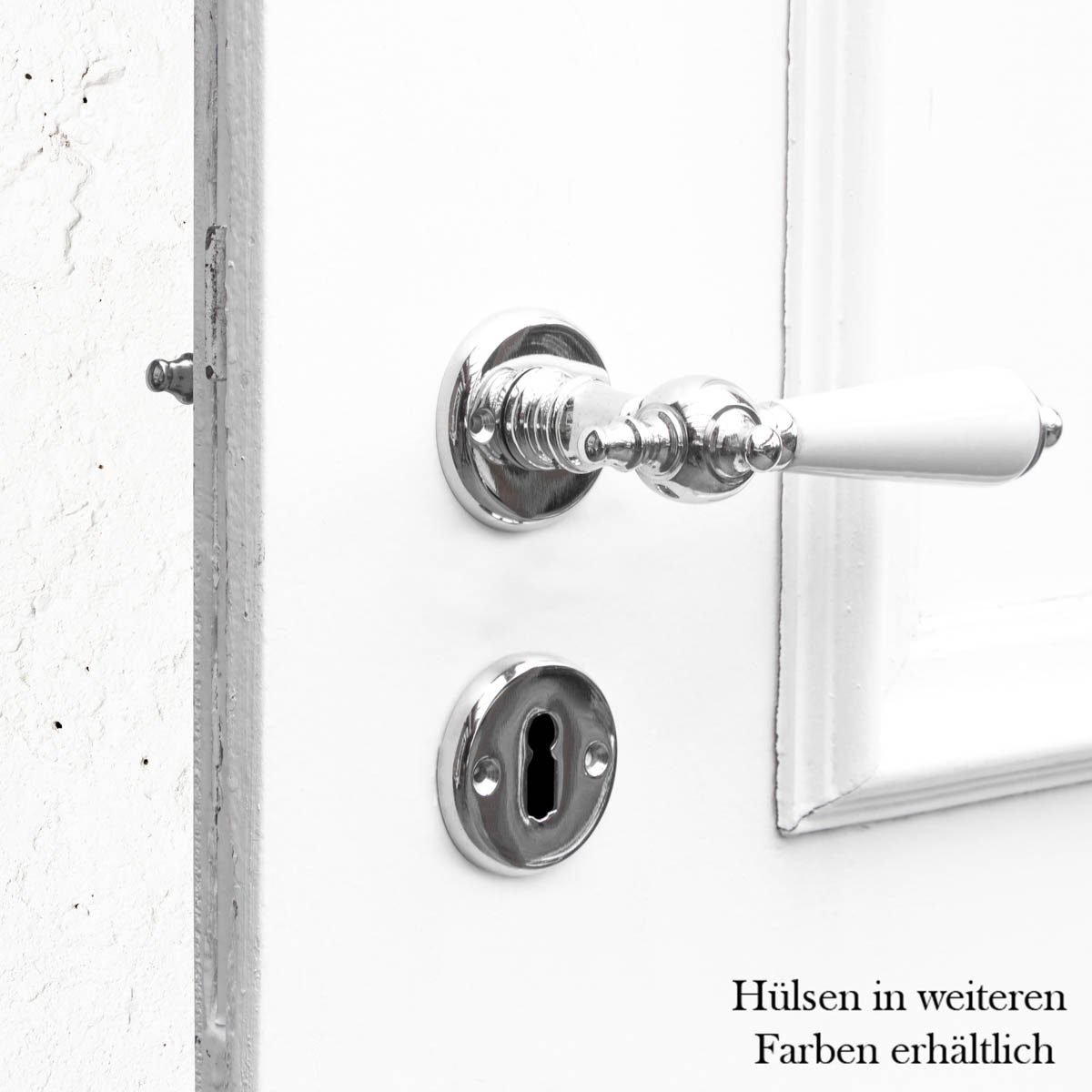 Nachgefertigt ist diese Garnitur nach antiken Türklinken aus glänzendem Nickel.