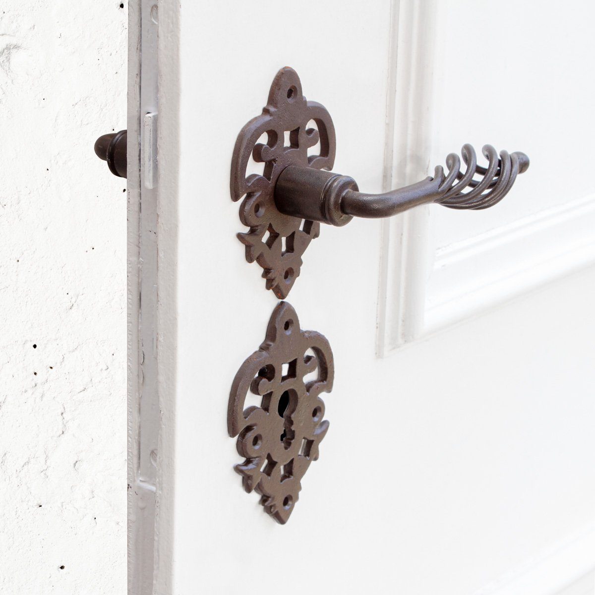 Das Besondere ist, dass die Schlossrosetten dieses Beschlages an Innentüren und ebenso an Haustürschlössern verwendet werden können: Die antik wirkende Öffnung so nämlich so gearbeitet, dass das Drehen des Schliesszylinders mit dem Schlüssel möglich ist, während die Öffnung historisch aussieht. Kein Problem wegen Rostens, denn diese aus Eisen gearbeitete Türbeschlag-Kombination ist wetterfest in matt dunkel.-braun lackiert.