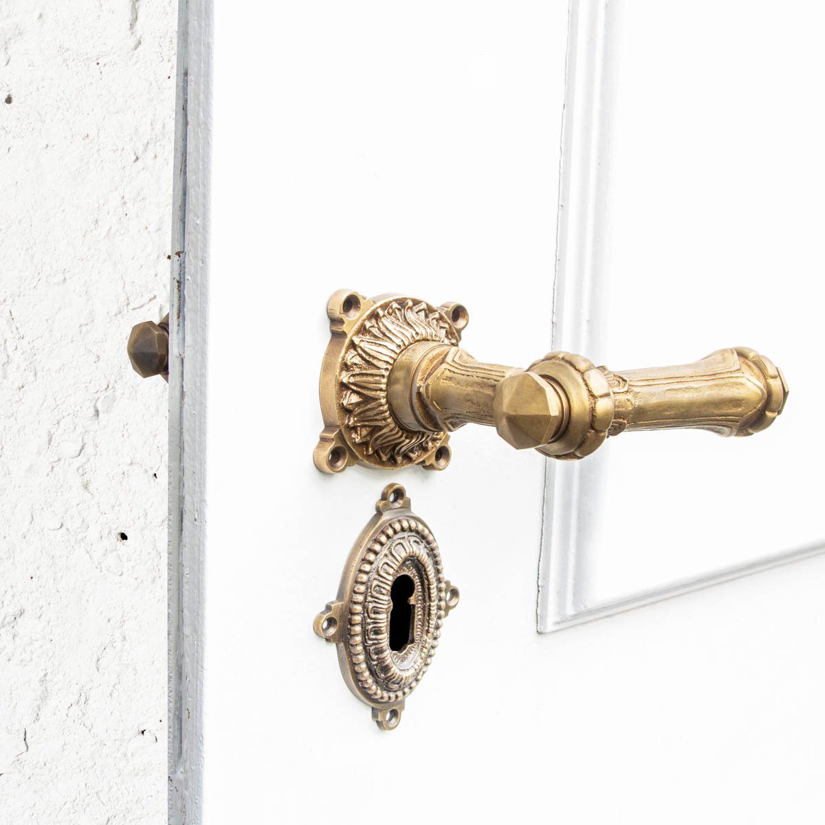 tags: antike Türbeschläge, Messing Türklinken, antike Messing-Garnituren, Gründerzeitstil, Stilbeschläge Messing, Türbeschlag mit Messing Klinken, antike Beschläge mit Rosetten, Messing Türklinken