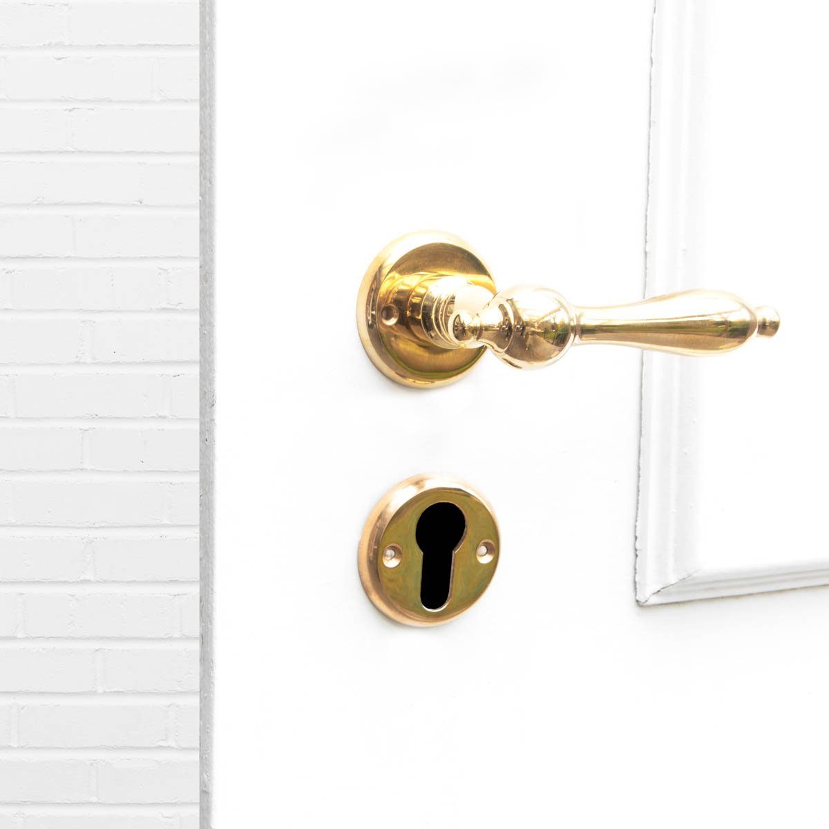 Lieferumfang: 2x Türklinken, 2x Klinken-Rosetten, 2x BB Schloss-Rosetten aus Messing glänzend und 1 Vierkantstift