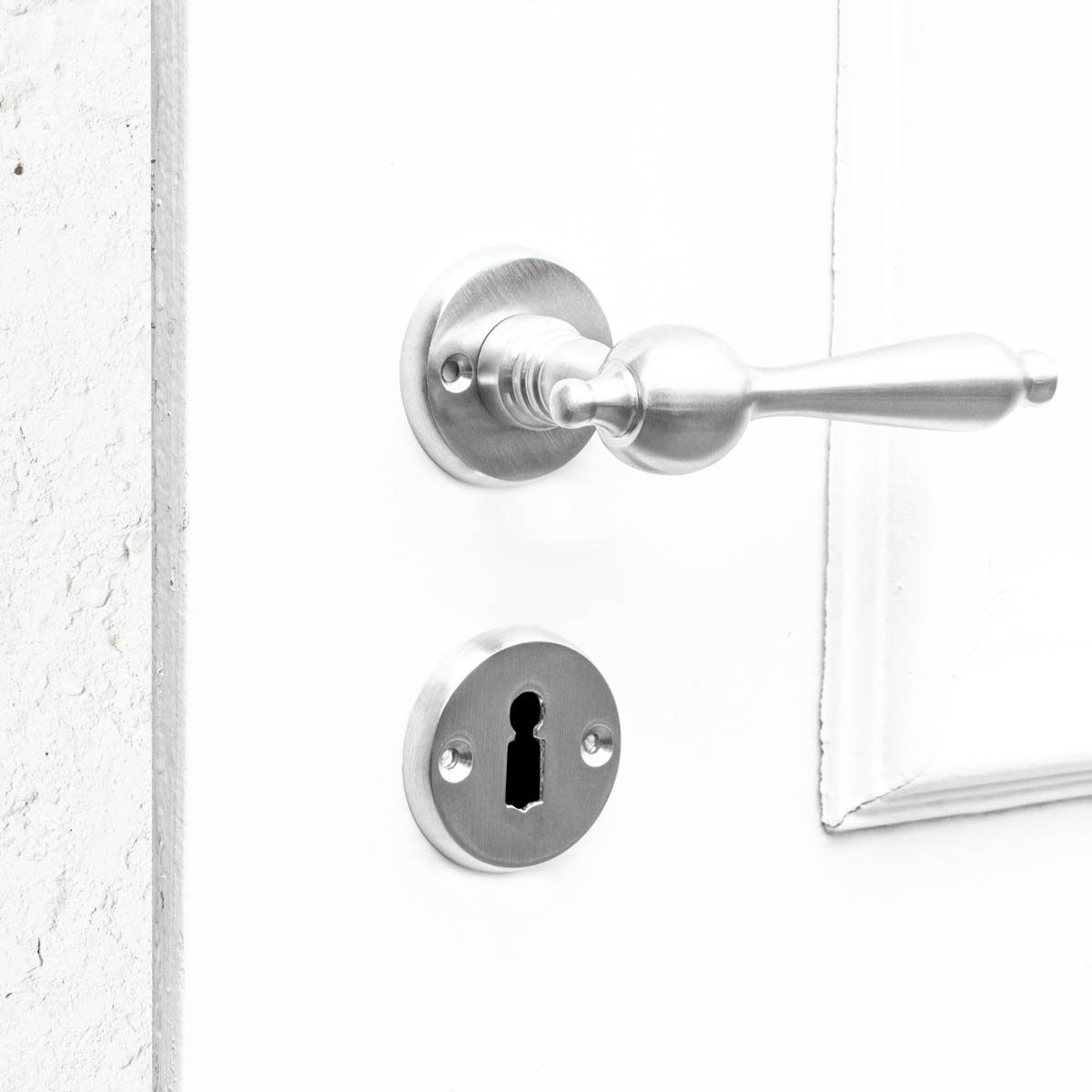 Diese zeitlose Drückergarnitur in ihrem silber-mattem Erscheinungsbild sorgt für ein schönes Ambiente. Es eignet sich für das gehobene, nostalgische als auch moderne Ambiente.