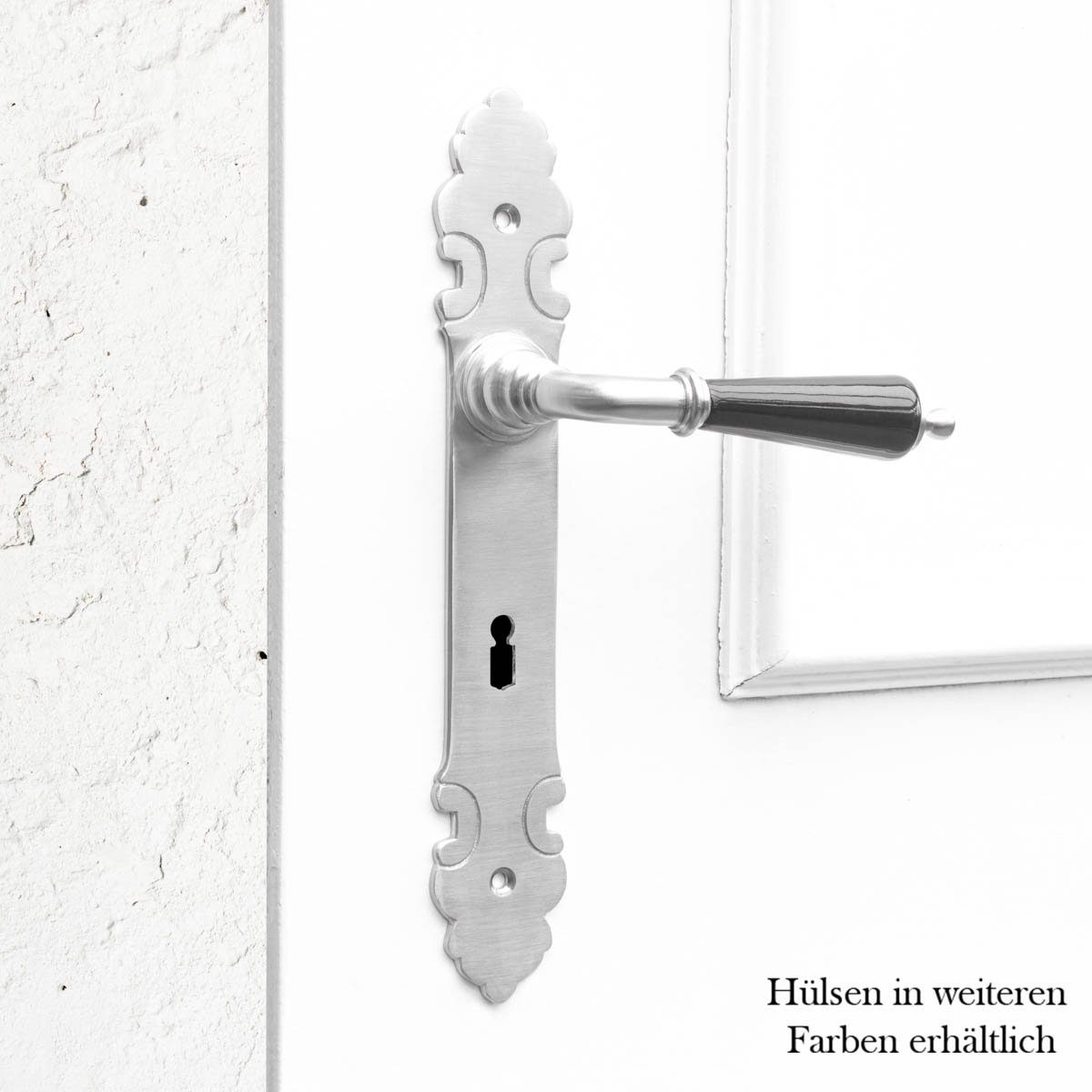 Die Porzellan-Farbe der Türklinken-Griffe ist schwarz.