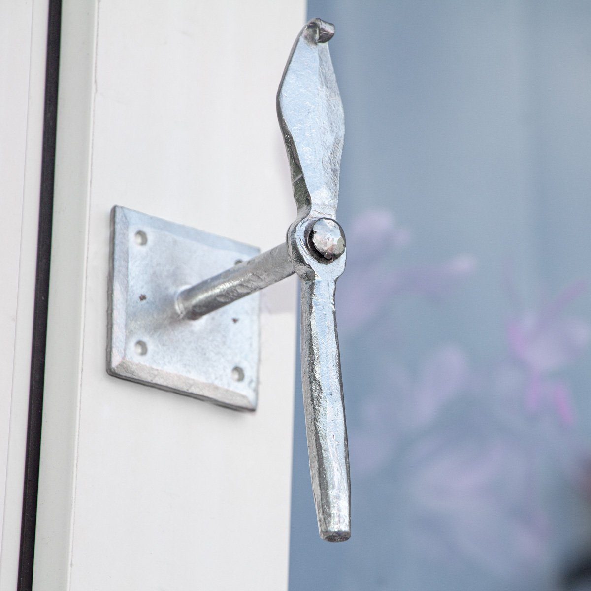 Er stellt ein stilechtes Zubehör für antike Fenster - denn der Wirbel sieht urwüchsig und wie handgeschmiedet aus.