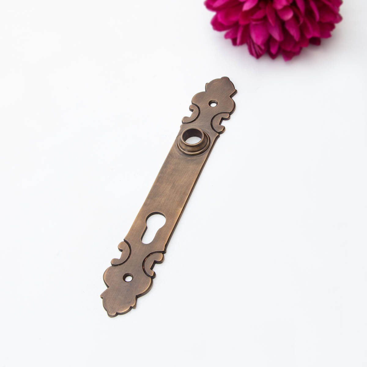 Schöne Ergänzung zu einer Biedermeier Haustür. Ein ansprechendes Langschild in Messing patiniert Nach antikem Türbeschlag Original ist dieses Langschild für historische Türen gearbeitet.