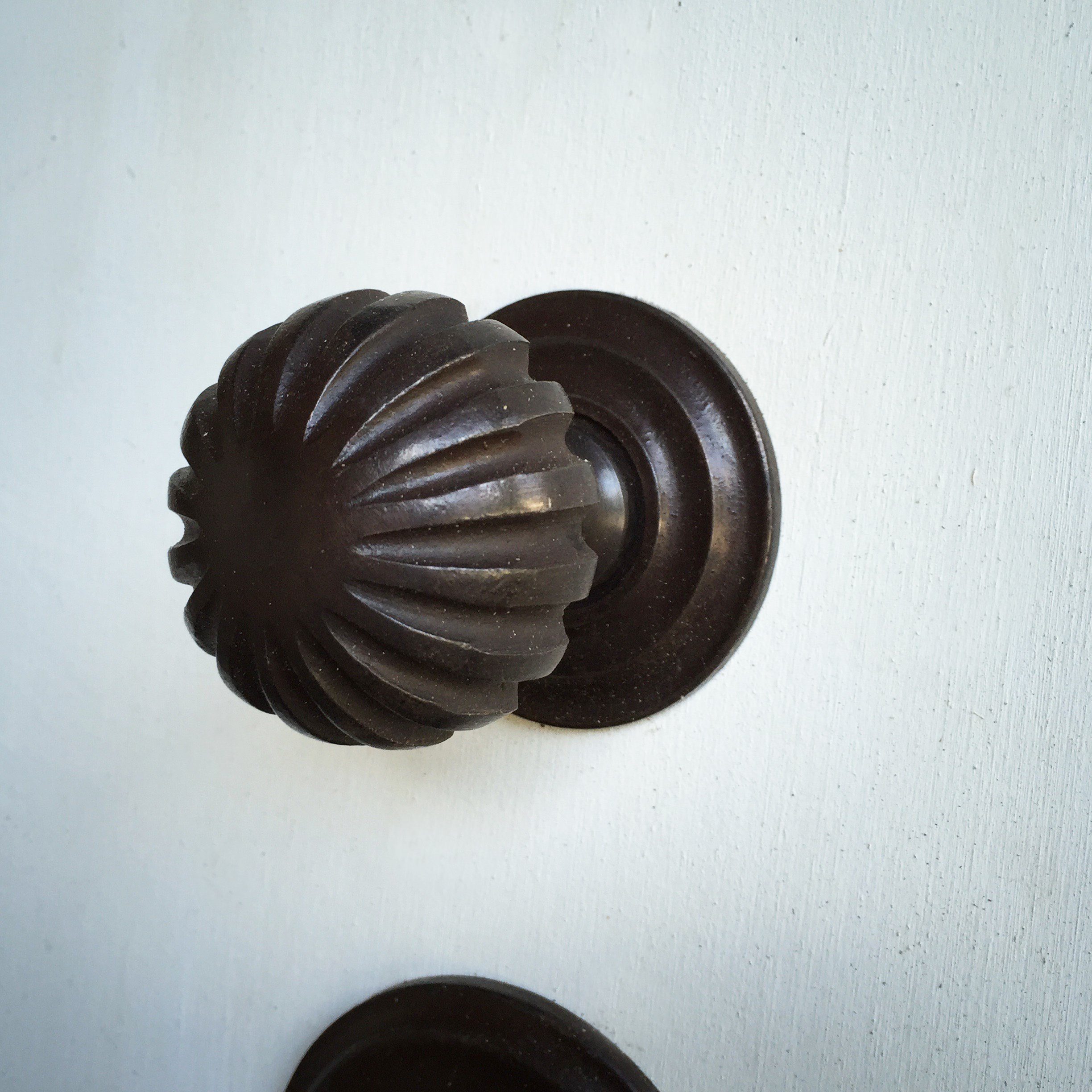 Türknauf als Türgriff für eine alte Haustür. Dieser Türknauf ist aus Antikeisen gefertigt: Formschöner Knauf mit Zier-Rosette.