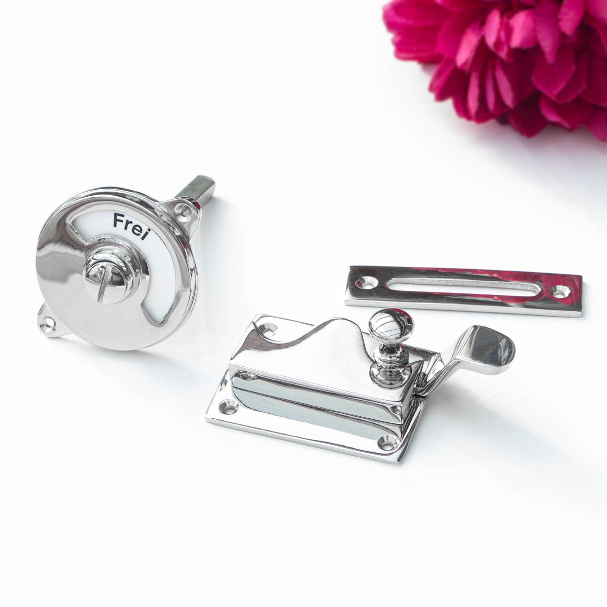 Der Toilettenverschluss ist gekröpft, wie auf der Abbildung zu sehen ( 2,5 cm vor dem Rahmen) Sehr schön hebt sich die Aufschrift: BESETZT und FREI vom Nickel ab.