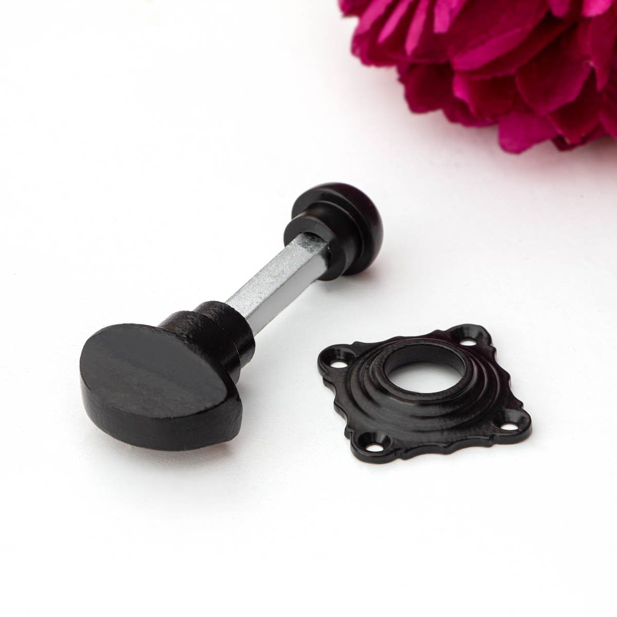 Die klassisch gestaltete Wc-Verschluss mit BB Rosette besteht aus aus schwarzem Gusseisen und einer schlicht gearbeiteten Rosette. Zusätzlich liegt ein Verschluss für Ihre Badezimmer oder WC Tür dabei und ist hochwertig gearbeitet.