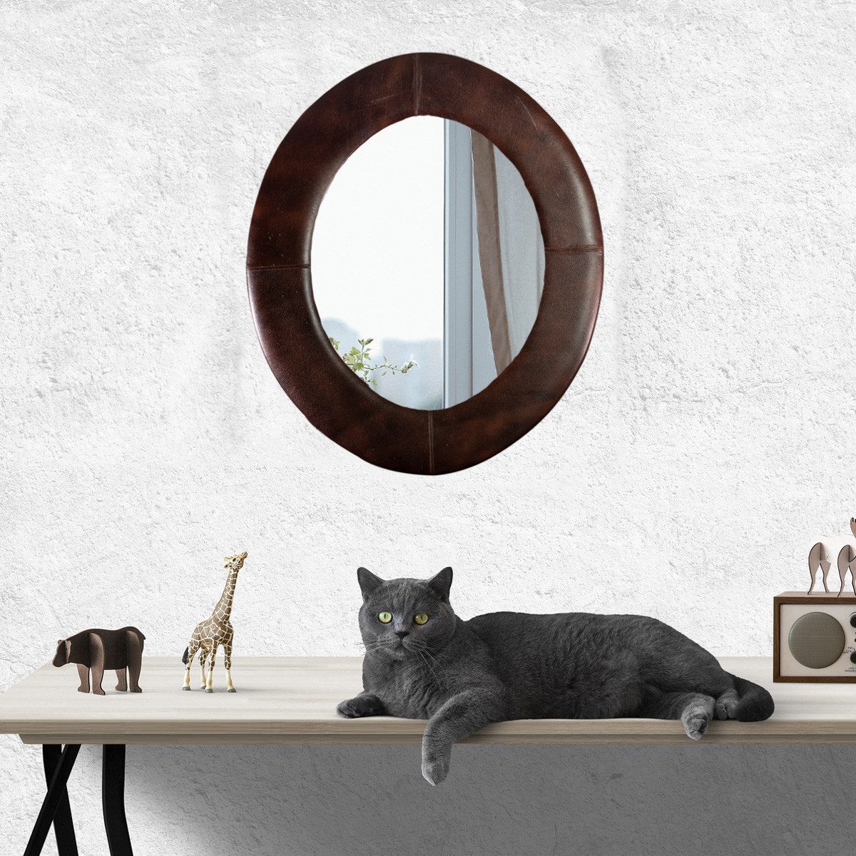 Wanddekoobjekt Ein stilvoller Spiegel mit Rahmen aus Echtem Leder, Oval, Braun