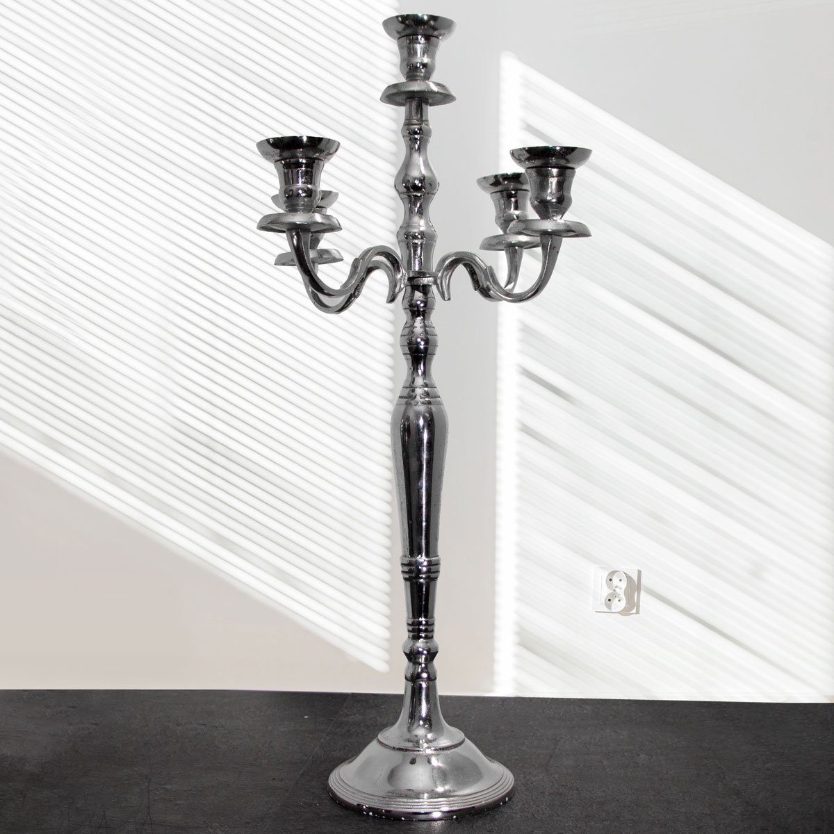 Ein so besonders schön gearbeiteter Kerzenleuchter fällt durch seinen effektvollen Oberflächenglanz gleich ins Auge und gibt dem Raum eine herrschaftlich stilvolle Atmosphäre.