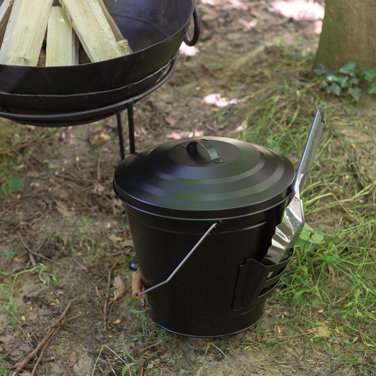 Dieser tolle Ascheeimer aus schwarzem Blech hat praktischerweise gleich eine Ascheschaufel zur Seite.