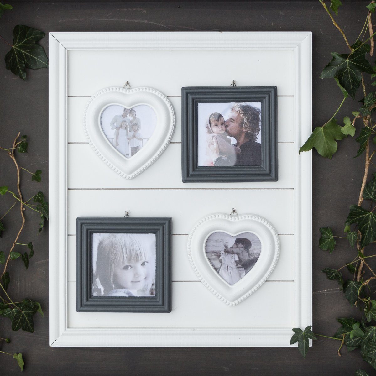 Lieferumfang: 1 Rahmen mit 4 Bilderrahmen ( 2 quadratische + 2 Herzförmige) aus Holz und MDF, weiß und grau lackiert