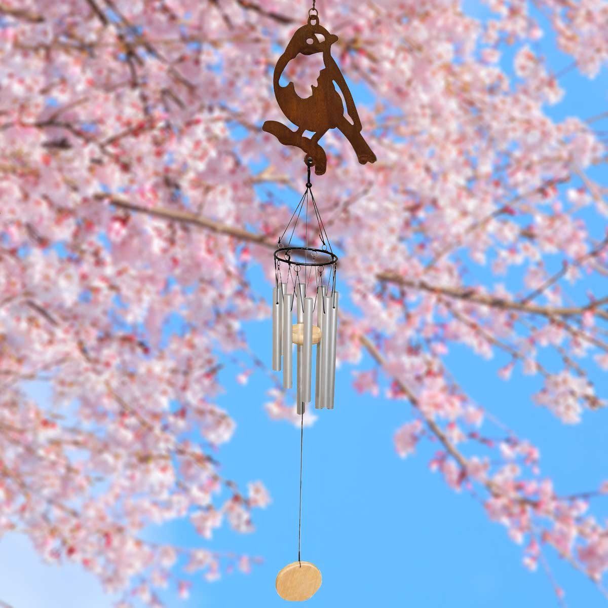 Das Windspiel mit dem rustikalen rostigen Vogel hat einen wunderschönen Klang im Wind.