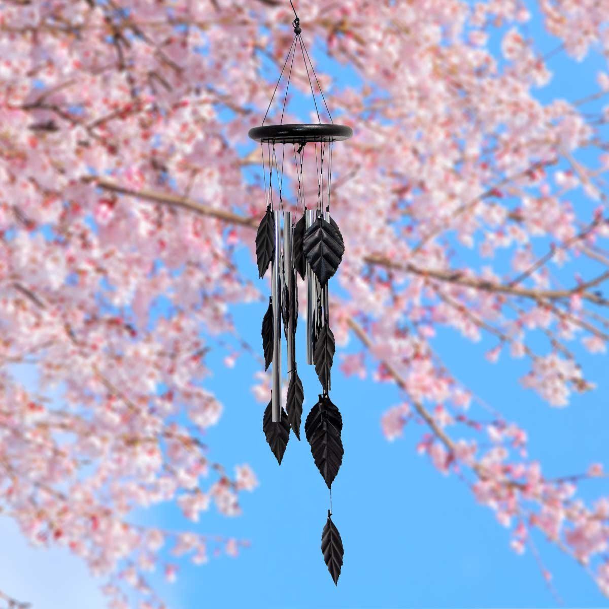 Das Windspiel mit dem rustikalen schwarzen Blättern hat einen wunderschönen Klang im Wind.