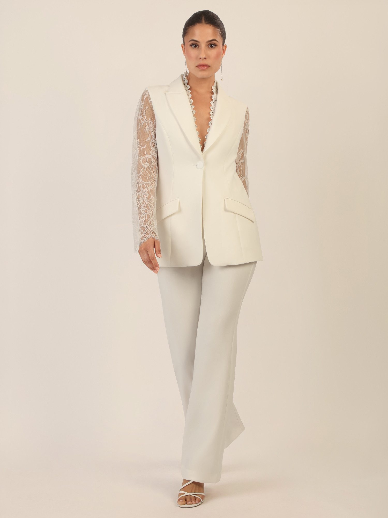 Ein Hosenanzug, der klassische Tailoring-Kunst mit romantischen Details vereint. Der figurbetont geschnittene Blazer besticht durch ein tiefes, aufsteigendes Revers und eine abknöpfbare Spitzenborte entlang der Ausschnittkante – ein edles Highlight mit Wandelbarkeit. Raffinierte Teilungsnähte formen das Oberteil präzise und unterstreichen die feminine Linie. Schräge Klappentaschen auf Hüfthöhe setzen praktische Akzente, während ein rückwärtiger Schlitz für Bewegungsfreiheit sorgt. Die langen Ärmel aus transparenter, weicher Spitze enden in einer zarten Bogenkante – ein stilvoller Kontrast zum strukturierten Bodypart, der vollständig gefüttert ist. Die passende Hose überzeugt mit einer eleganten Bootcut-Silhouette und fein abgestimmten Details: Ein geformter Bund mit Spitzenapplikation trifft auf klassische Gürtelschlaufen und einen verdeckten Hakenverschluss. Schräge Eingriffstaschen runden das Design alltagstauglich ab. Dieser Zweiteiler ist ein moderner Klassiker – raffiniert, feminin und mit viel Liebe zum Detail. Blazerlänge ca. 68?cm, Seitenlänge der Hose ca. 108?cm.