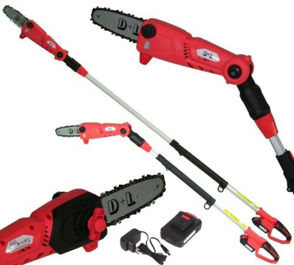 Dieser kraftvolle 20 V Akku-Teleskop-Hoch-Entaster entfernt Äste und Zweige auch in größeren Höhen und ist mit einem 24 cm Qualitätsschwert mit Kette ausgestattet. Diese sorgt für eine ausgezeichnete Schnittleistung auch bei dickeren Ästen. Mit dem  kabellosen Akku-Teleskopstielentaster lassen sich Kronen und Äste völlig Netz ungebunden und komfortabel schneiden. Die Astsäge bietet zusätzlich einen integrierten Kettenspanner und automatische Kettenschmierung. Die leichte Alu-Teleskopverlängerung ist auf eine Длина zwischen 1,67 und 2,30 m stufenlos einstellbar, sodass hohe Arbeitshöhen erreicht werden können. Der 4-fach winkelverstellbare Schneidkopf mit einer Schnittlänge von 170 mm sorgt für ein sicheres Handling auch in beengten Baumkronen. Die sehr leichte 3,9 kg Astsäge lässt sich bequem mit und ohne Schultergurt halten. Der mitgelieferte Köcherschutz schützt das Schwert vor Schäden bei Transport und Lagerung. Das mitgelieferte Ladegerät und der leistungsstarke 20 V / 2000 mAh Lithium-Ionen Akku passt für alle 20 V Geräte der D+L 20 V-Akku-Gartenserie.