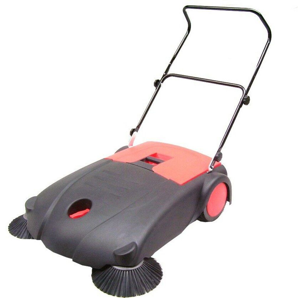 Robuste Handkehrmaschine mit hochwertigem Kunststoff Gehäuse und beidseitigem Gummiriemenantrieb für sicherer Kraftübertragung. Leichte Handhabung dank vorderer Lenkrolle und klappbarem Fahrbügel. Die zwei Seitenbesen fegen das Kehrgut vor die gegeneinander laufenden Hauptkehrwalzen mit einer Arbeitsbreite von 80 cm. Diese greifen den Staub und Schmutz gemeinsam auf und fördern ihn im Überwurf-Prinzip in den Schmutzbehälter. Der Anpressdruck der Seitenbesen und der Hauptkehrwalzen ist einstellbar für optimale Kehrleistung. Die große Antriebsräder mit Gummibereifung sorgen für optimale Antriebshaftung. Ideal für Haus und Hof.