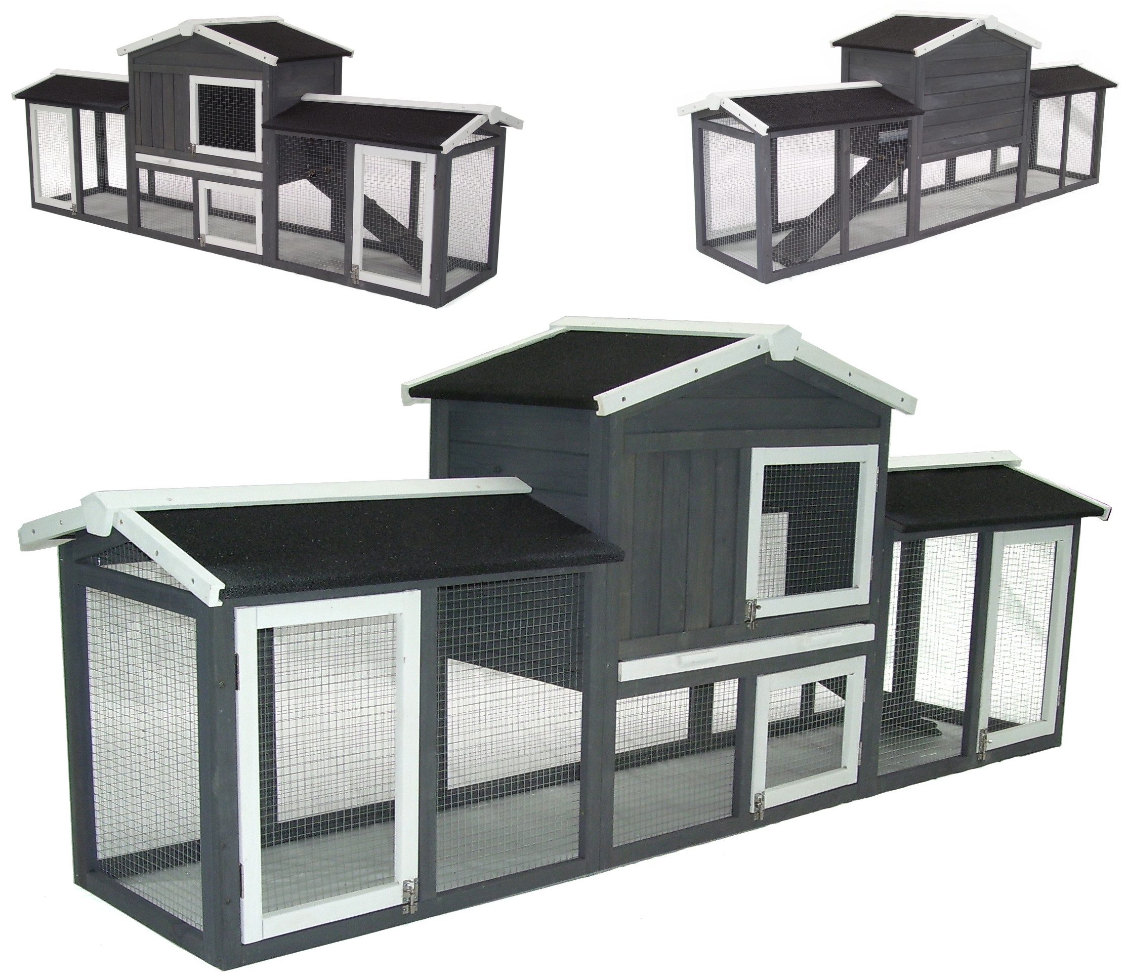 Behandelt mit wasserfester Farbe ist der elegante anthrazit-weiße Hasenstall mit stabilem Dach, sehr großzügige aufgeteilt, mit integriertem Auslauf für Kaninchen, Hasen und Nagetiere.