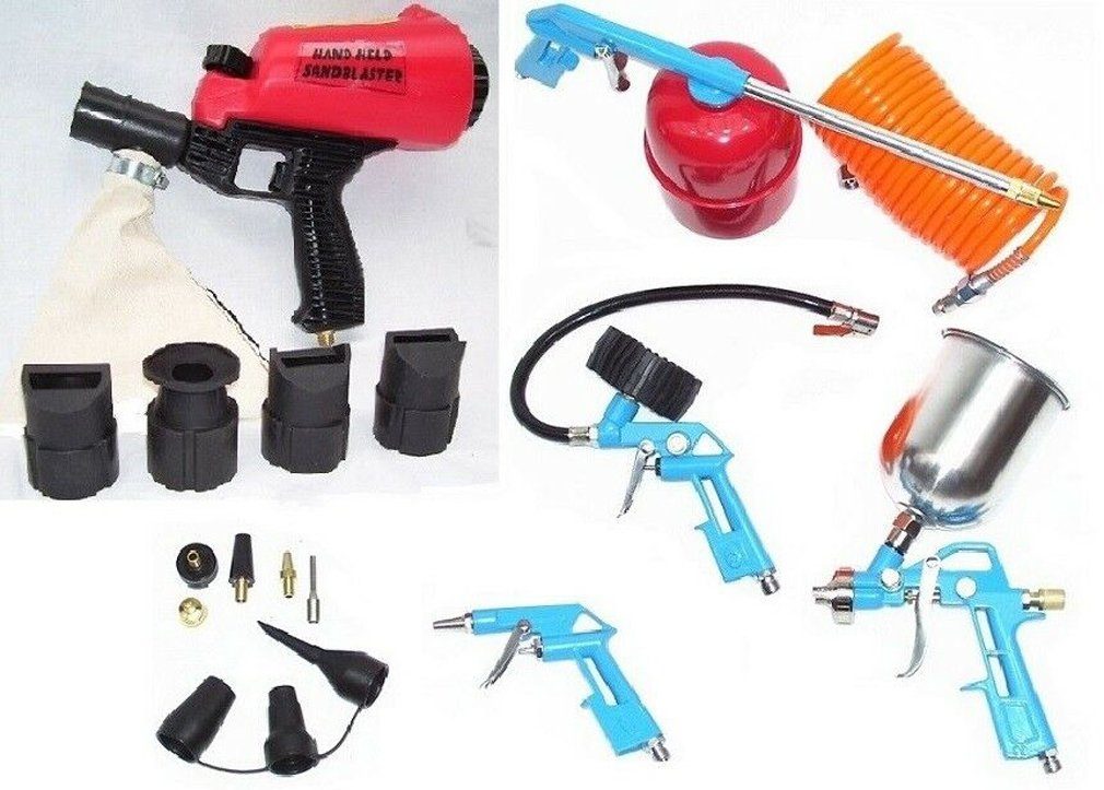 1 x Sandstrahlpistole, staubfrei Sandstrahl-Set incl. 4 x verschiedene Strahlaufsätze Sandstrahlpistole mit Rückgewinnungs-Auffangsack