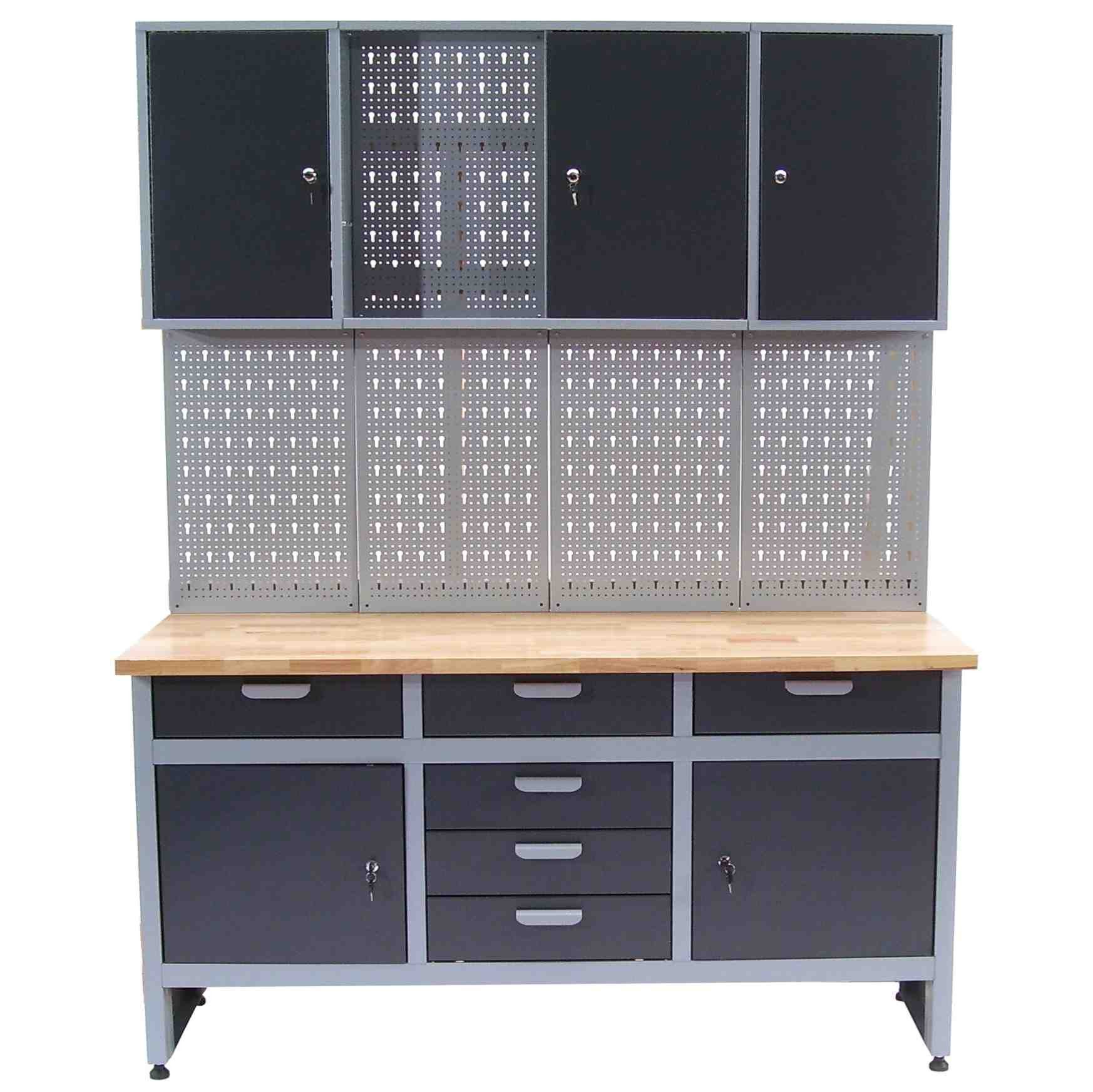 - robuste pulverbeschichteter Werkbank-Set mit Lochwand und Hängeschränken inkl. Stäbchenverleimte Holzplatte