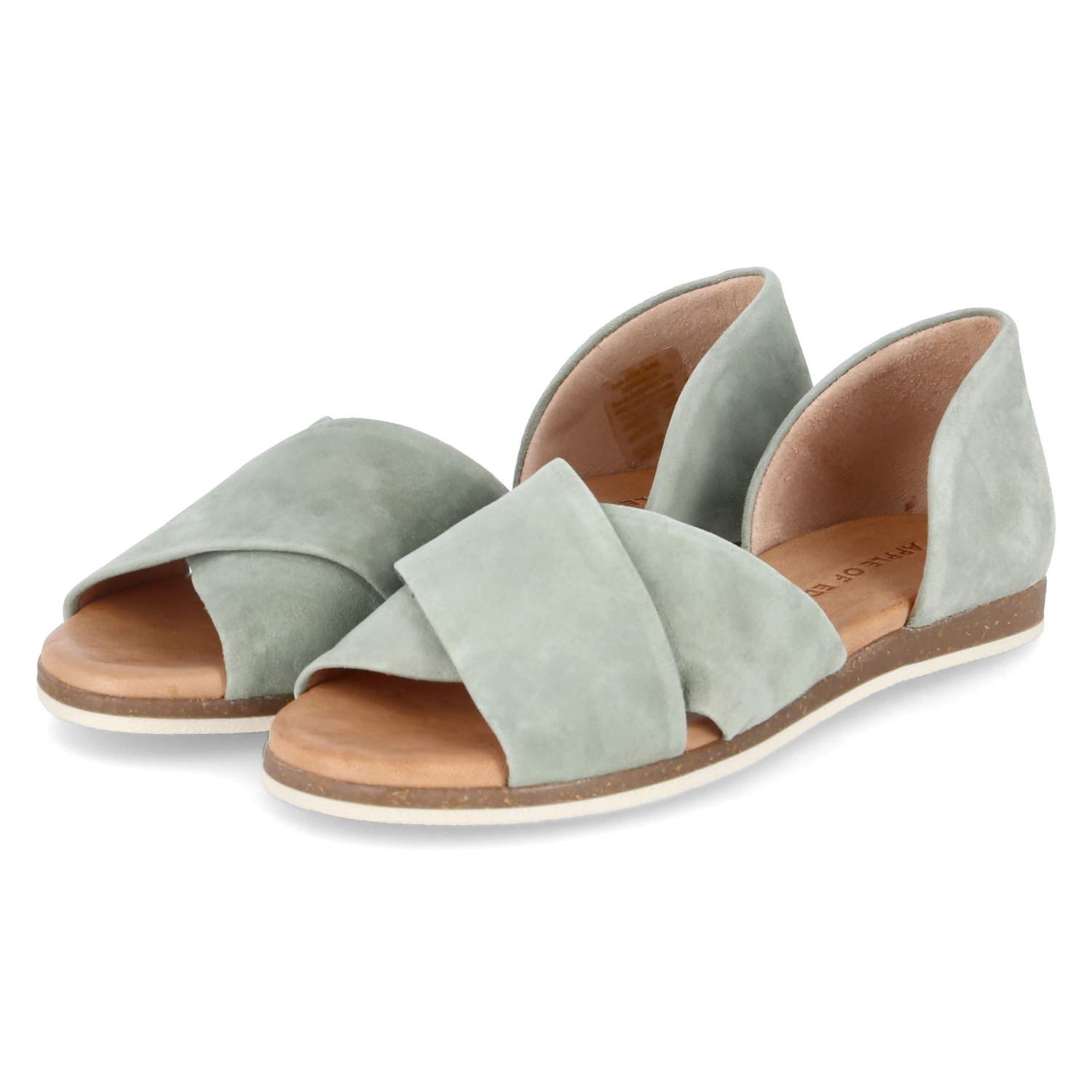 Die grünen Sandalen CHIUSI aus Rauleder von APPLE OF EDEN vereinen stilvolle Eleganz mit hohem Tragekomfort. Die samtige Oberfläche verleiht dem Modell eine edle Haptik, während die breiten, gekreuzten Riemen vorne für eine harmonische Optik und guten Halt sorgen. Der verschlusslose Einstieg mit geschlossener Ferse im D’Orsay-Stil betont die feminine Silhouette und ermöglicht ein bequemes Tragegefühl. Das gepolsterte Lederfußbett sorgt für weichen Laufkomfort, während das hochwertige Lederfutter die Atmungsaktivität unterstützt. Die flexible, rutschfeste Laufsohle bietet Stabilität und angenehme Bewegungsfreiheit. Perfekt kombinierbar mit fließenden Sommerkleidern oder leichten Stoffhosen für einen stilvollen und entspannten Look an warmen Tagen. Ein eleganter Begleiter für jede Gelegenheit.