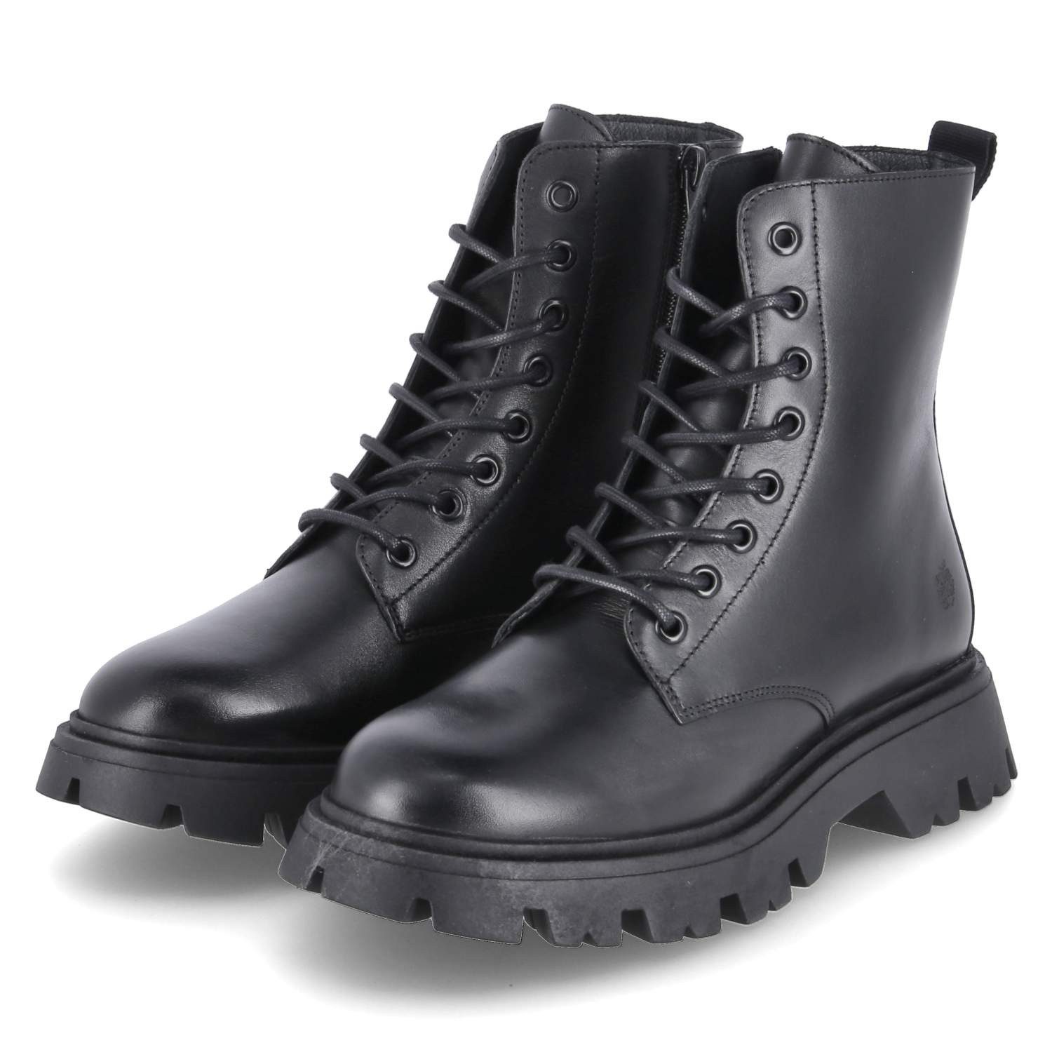 Die Apple of Eden Damen Stiefeletten/Combat Boots ROMA 1 aus schwarzem Glattleder vereinen Stil und Funktionalität. Diese Stiefeletten zeichnen sich durch ihr geringes Gewicht und ihre robuste Konstruktion aus. Ein praktischer Reißverschluss und eine Schnürung ermöglichen einfaches An- und Ausziehen, während die Anziehlasche zusätzlichen Komfort bietet.