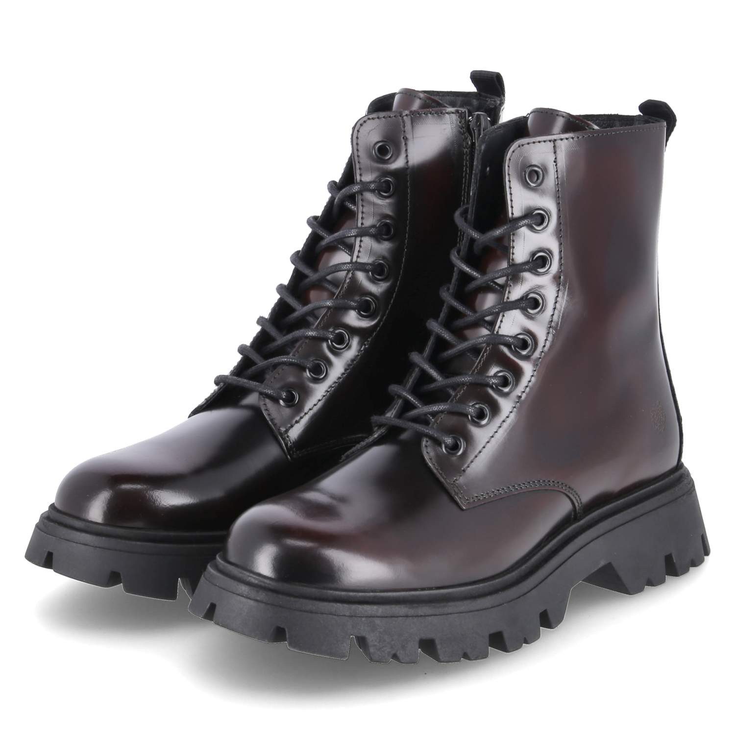 Die Apple of Eden Damen Stiefeletten/Combat Boots ROMA 59 aus rot-schwarzem Lackleder vereinen auffälliges Design mit hohem Tragekomfort. Diese stilvollen Stiefeletten sind leicht und verfügen über einen praktischen Reißverschluss sowie eine Schnürung, die ein einfaches An- und Ausziehen ermöglichen. Eine Anziehlasche sorgt für zusätzlichen Komfort.