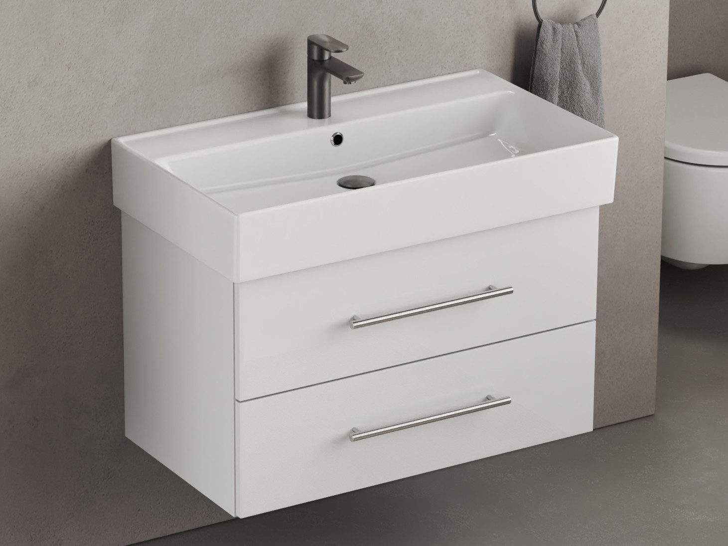 Das Aqua Bagno Flex Badmöbel-Set mit 81 cm Breite vereint moderne Eleganz, langlebige Materialien und funktionale Ausstattung. Der Keramikwaschtisch 10.14.30.001.01 überzeugt durch pflegeleichte Oberfläche, integrierten Überlauf und hochwertige Verarbeitung. Der passende Unterschrank in Weiß Hochglanz ist mit einer aufwendig mehrfach veredelten Lackierung versehen, die geschmeidig, schmutzabweisend und feuchtigkeitsbeständig ist. Innen wie außen gleichfarbig gestaltet, entsteht ein harmonisches Gesamtbild. Zwei geräumige Schubladen sorgen für praktischen Stauraum und sind mit dem Hettich Vollauszugsystem Quadro Silent System ausgestattet. Dieses Premiumsystem garantiert hohe Belastbarkeit, sanftes Gleiten und Softclose-Komfort. Dank dreidimensional verstellbarer Schrankaufhänger ist eine einfache Justierung und sichere Wandmontage gewährleistet. Vormontiert geliefert, spart das Möbelstück Zeit und erleichtert die Installation. Mit seiner Kombination aus glänzender Oberfläche, robuster Keramik und funktionalem Stauraum ist dieses Badmöbel-Set eine langlebige Lösung für stilvolle Badezimmer.