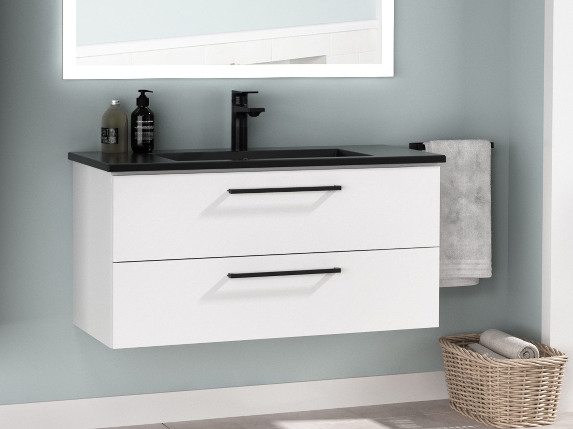 Das Angular Badmöbel mit 100 cm Breite verbindet modernes Design mit maximaler Funktionalität. Der hochglanzlackierte Unterschrank in Weiß wird durch das stilvolle, schwarze Keramikwaschbecken ergänzt, das Ihrem Badezimmer eine elegante Note verleiht.