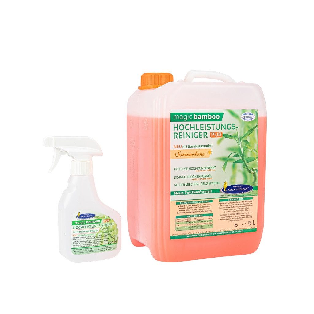 Set beinhaltet | 1x AQUA CLEAN Magic Bamboo Hochleistungsreiniger 5l Konzentrat 1x Sprühflasche 1x Abfüllhahn |
