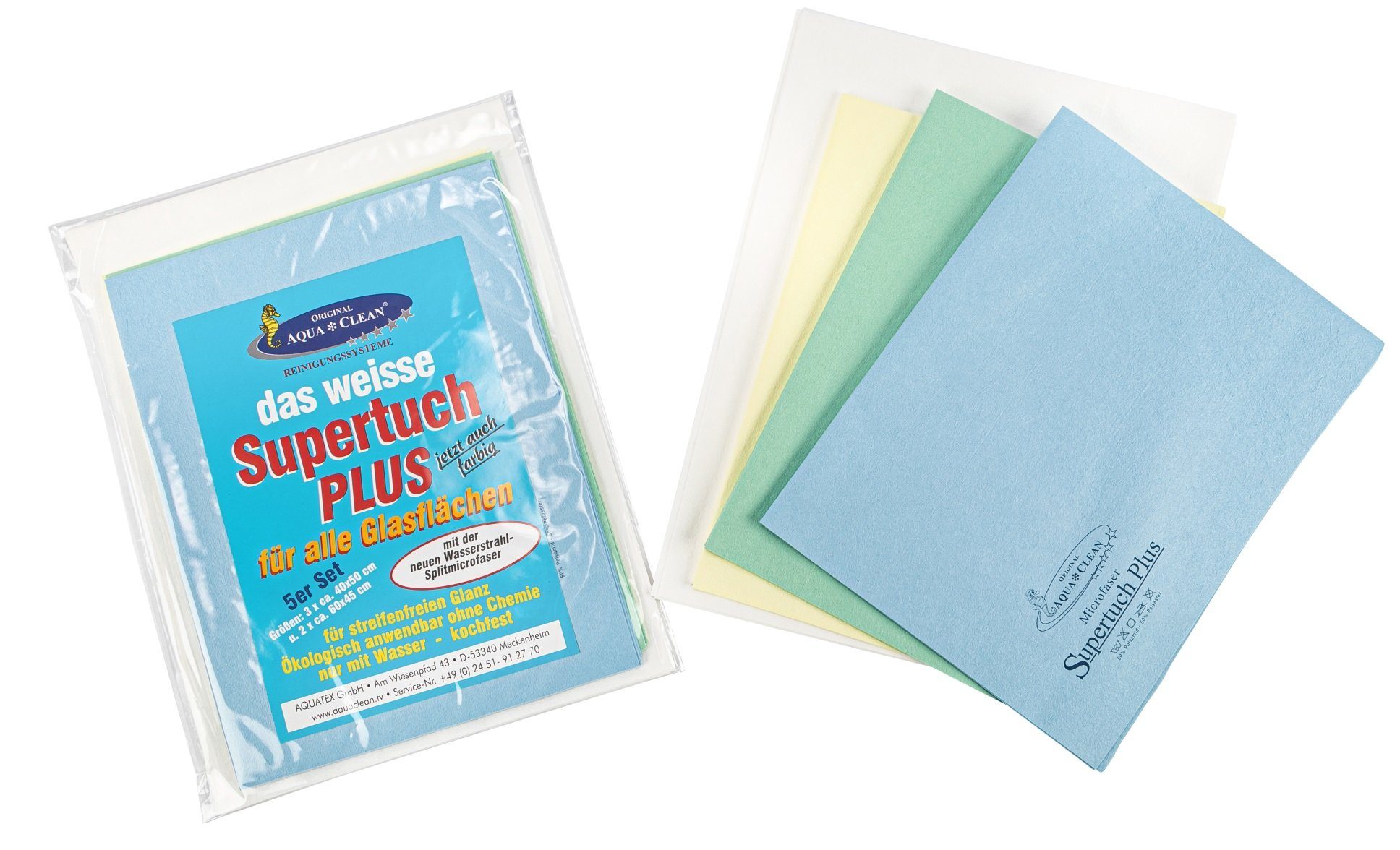AQUA CLEAN Splitmicrofaser Supertuch Plus bietet Ihnen völlige Streifenfreiheit für alle Glas- und Spiegelflächen. Es kombiniert die Vorteile eines Microfasertuchs und eines Ledertuchs und ist daher sowohl zum Trocknen als auch zum Nasswischen geeignet. Die Reinigung erfolgt wie bei allen Microfaserprodukten ganz ohne Zusätze von Reinigungsmittel – einfach nur mit klarem Wasser. Empfehlung: Das Microfasertuch vor dem ersten Gebrauch 10-15 Minuten. in heißem Wasser einweichen, danach unter klarem Wasser gut ausspülen. Verwenden Sie nur klares Wasser! Idealerweise setzen Sie das Microfasertuch leicht angefeuchtet ein. Auf chemische Reinigungsmittel können Sie dabei verzichten. Aufgrund seiner einmaligen Struktur löst und nimmt AQUA CLEAN Split Microfaser Supertuch Plus sogar fetthaltigen Schmutz auf und sorgt für äußerst gründliche, aber auch schonende und streifenfreie Reinigung. Sollten trotzdem Wasserränder zurückbleiben, war das AQUA CLEAN Split Microfaser Supertuch Plus Tuch zu feucht. Wringen Sie das AQUA CLEAN Split Microfaser Supertuch Plus Tuch nochmals aus und reinigen Sie die Oberfläche erneut. FENSTER UND SPIEGEL * * * streifenfrei sauber - ohne nachpolieren * * * Gebrauchshinweise: Schützen Sie die Tücher vor starker Hitze, aggressiven Säuren, sowie vor mechanischen Abrieb, der z.B. durch das Reinigen von scharfen, stark rauen oder rissigen Oberflächen hervorgerufen wird. - Das Tuch ist waschbar bei 30°C, 40°C, 60°C oder 95°C ohne Zugabe von Weichspüler. - Nicht mit Weißwäsche zusammen waschen. Trockner geeignet. Set Inhalt: 3x AQUA CLEAN Supertuch Plus 40cm x 50cm 2x AQUA CLEAN Supertuch Plus 60cm x 45 cm Material: 50% Polyester / 50% Polyamid Pflegehinweis: Tücher nicht in die Weißwäsche geben. Waschbar bis 95°C (ohne Zugabe von Weichspüler). Wäschetrockner geeignet.