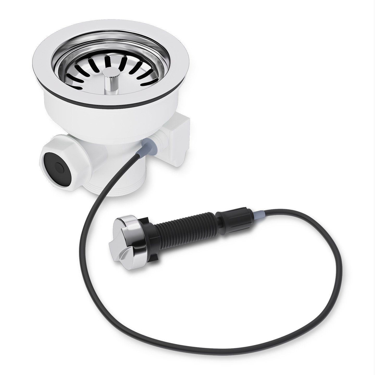 Das 3 1/2" große Siebkorbventil besitzt ein herausnehmbares Siebkörbchen, das durch einen Excenter-Drehknopf (per Bowdenzug) geöffnet werden kann. Der Geruchsverschluss kann einfach flach an der Wand ausgeführt werden. So kann beispielsweise auch in kleineren Unterschränken noch ein Abfalltrennsystem eingebaut werden.