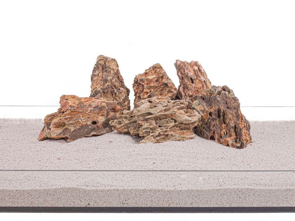 Die Oberfläche des asiatischen Gesteins erinnert durch parallel angeordnete Löcher und Vertiefungen an Drachenhaut. In Verbindung mit grünen Pflanzen ergibt sich ein edles Farbenspiel. Die Steine können auch mit Wurzeln aller Art kombiniert werden und fügen sich sehr schön in das Gesamtbild ein.