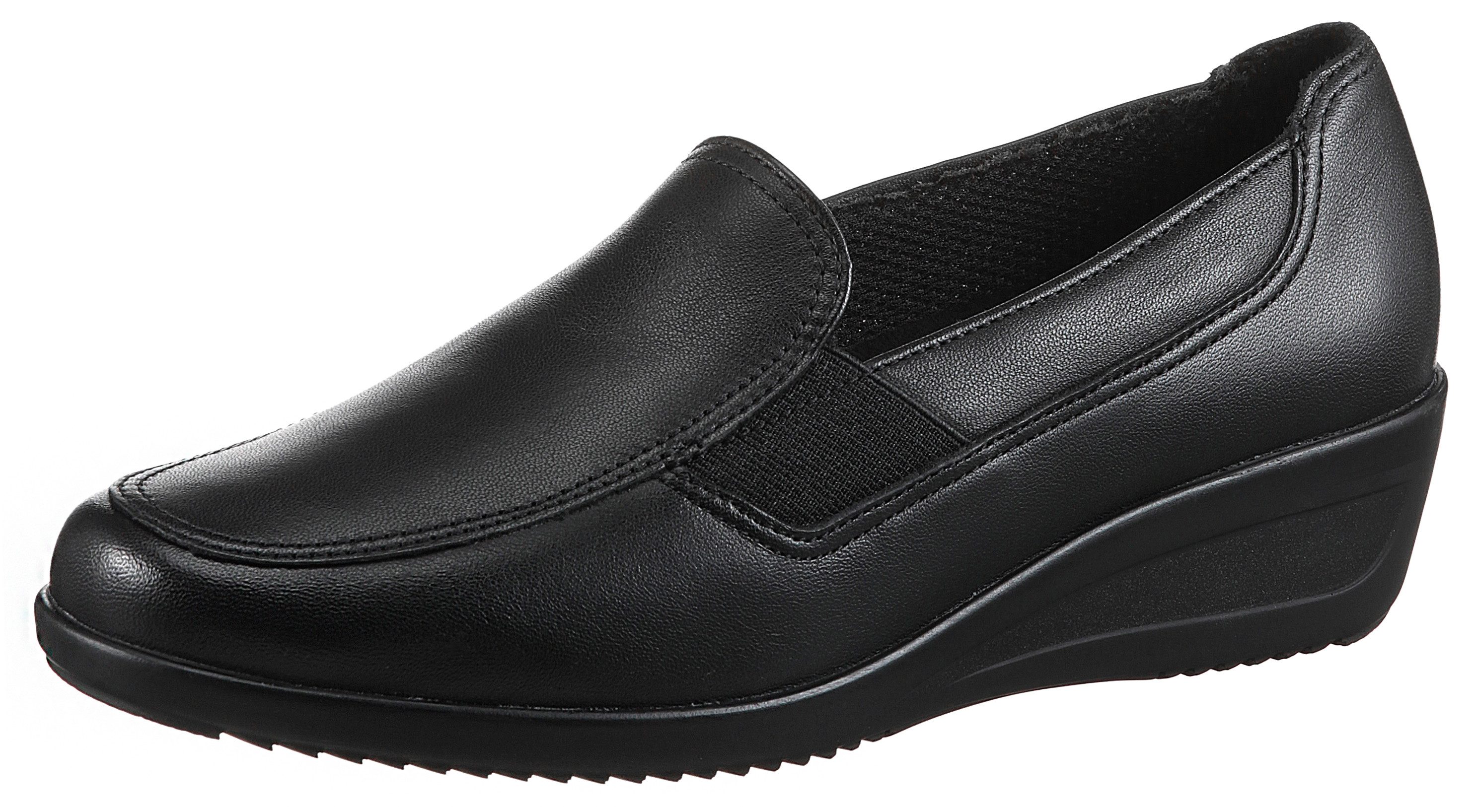Mit dem Obermaterial aus Nappaleder sind die Schuhe hochwertig und sehr weich. Dank der profilierten Sohle aus Synthetik sorgen die Slippers für mehr Rutschfestigkeit auf unebenem Untergrund. Die herausnehmbare Innensohle aus Textil bietet zusätzliche Flexibilität und ermöglicht die Verwendung individueller Einlagen oder orthopädischer Sohlen. Dank dem Keilabsatz sind die Slippers ideal für den Alltag und lange Tragezeiten. Diese Slippers in Weite H sind für kräftigere, volle Füße geeignet.