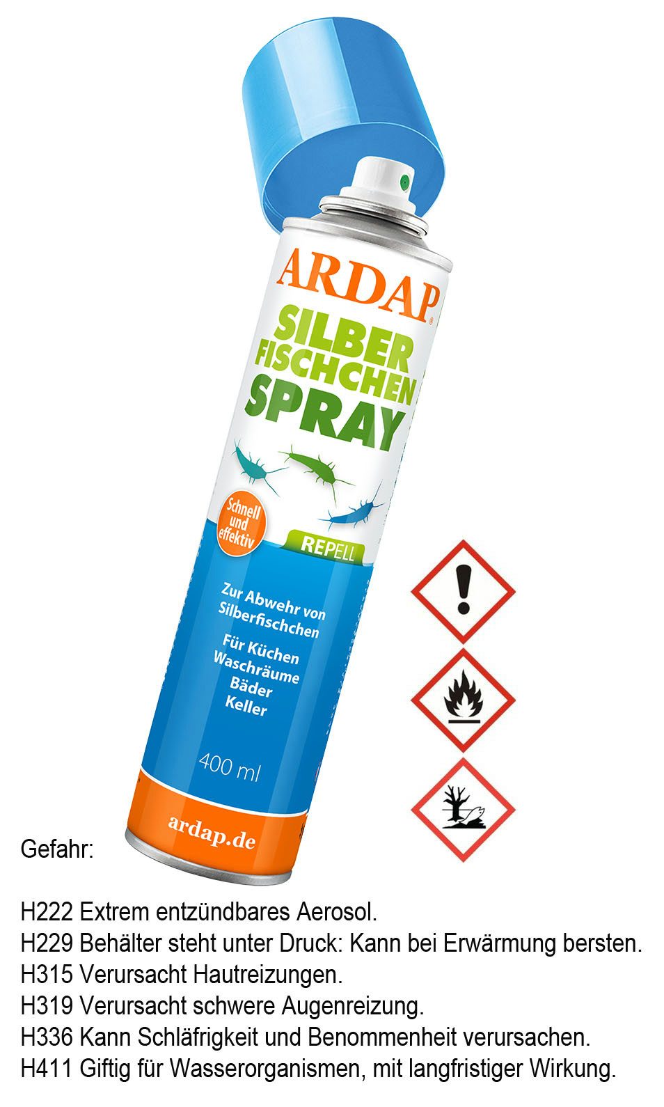 Hält Ungeziefer zuverlässig fern. Dose vor Gebrauch gut schütteln. Von Ungeziefer bevorzugte Plätze mit ARDAP Repell Silberfischchenspray besprühen. Nicht bis zu sichtbarer Nässe und tropfendem, schlierendem Belag sprühen. Produkt nicht großflächig anwenden. Es empfiehlt sich eine Strecke von zwei Metern eine Sekunde lang (entspricht 1,5 g) zu besprühen. Bei sehr empfindlichen und polierten Flächen erst vorsichtig Probebehandlung vornehmen. Vor der Anwendung Aquarien und Terrarien abdecken. Während des Sprühvorganges Katzen fernhalten. Bei Bedarf Anwendung wiederholen. Bei Wespen: Nur im Gefahrfall (Bedrohung) einsetzen oder durch professionelle Anwender. Nicht gegen geschützte Arten wie Kreiselwespen, Knopfhornwespen, Keulhornblattwespen oder Dolchwespen einsetzen. Nach der Anwendung für ausreichende Belüftung sorgen. Leichter Sprühbelag trocknet fleckenlos ein. Nicht mehr erwünschte Mittelbeläge auf behandelten Oberflächen können mit handelsüblichen, wässrigen Allzweckreinigern entfernt werden.