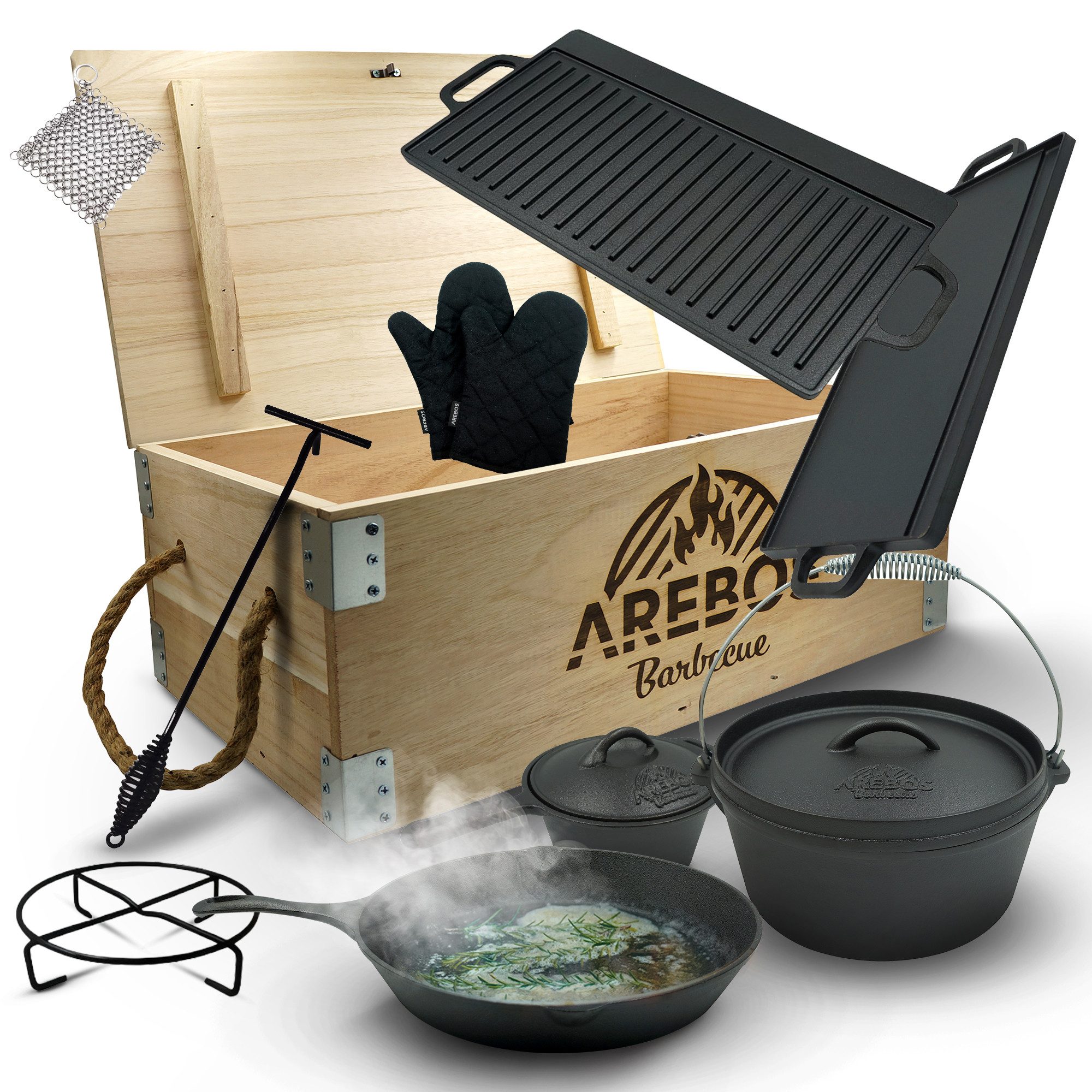 Lieferumfang | 1x Aufbewahrungsbox aus Holz 1x Dutch Oven Topf mit Deckel 1x Soßentopf mit Deckel 1x Bratpfanne 1x Wendeplatte 1x Deckelheber 1x Topfständer 1x Ringreiniger 2x Handschuhe |