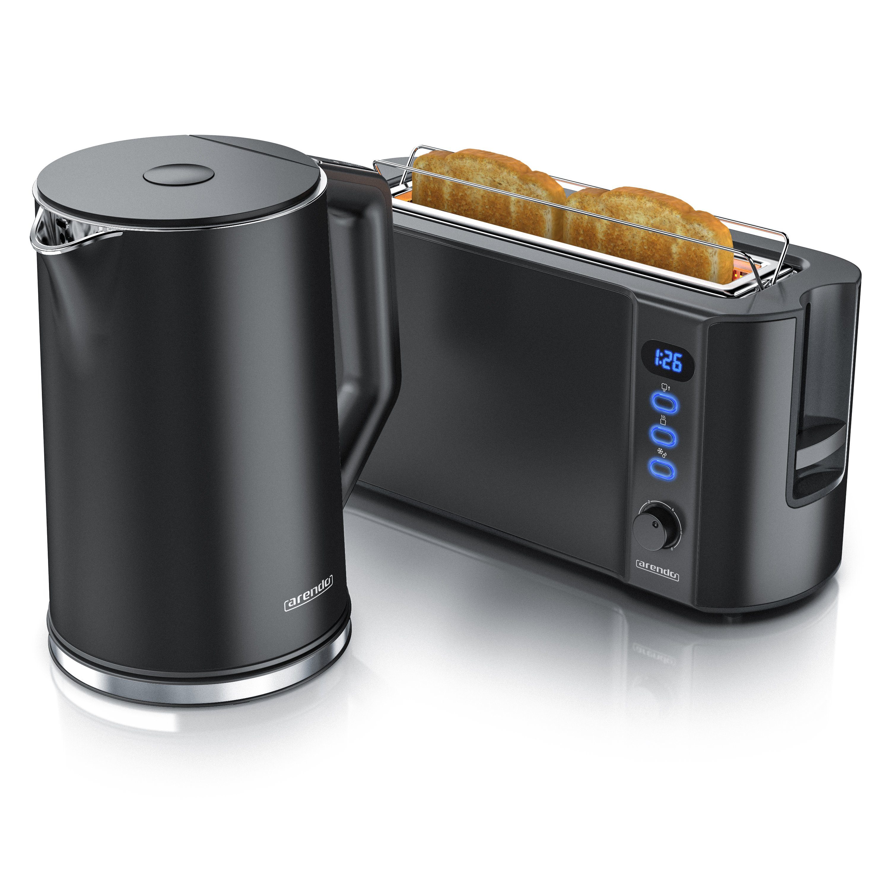 Top-Features | Schnelle Erhitzung des Wassers dank 2200 W 6-stufige Bräunungseinstellung im Toaster Warmhaltefunktion im Wasserkocher für konstante Temperaturen langlebiges Edelstahlgehäuse |