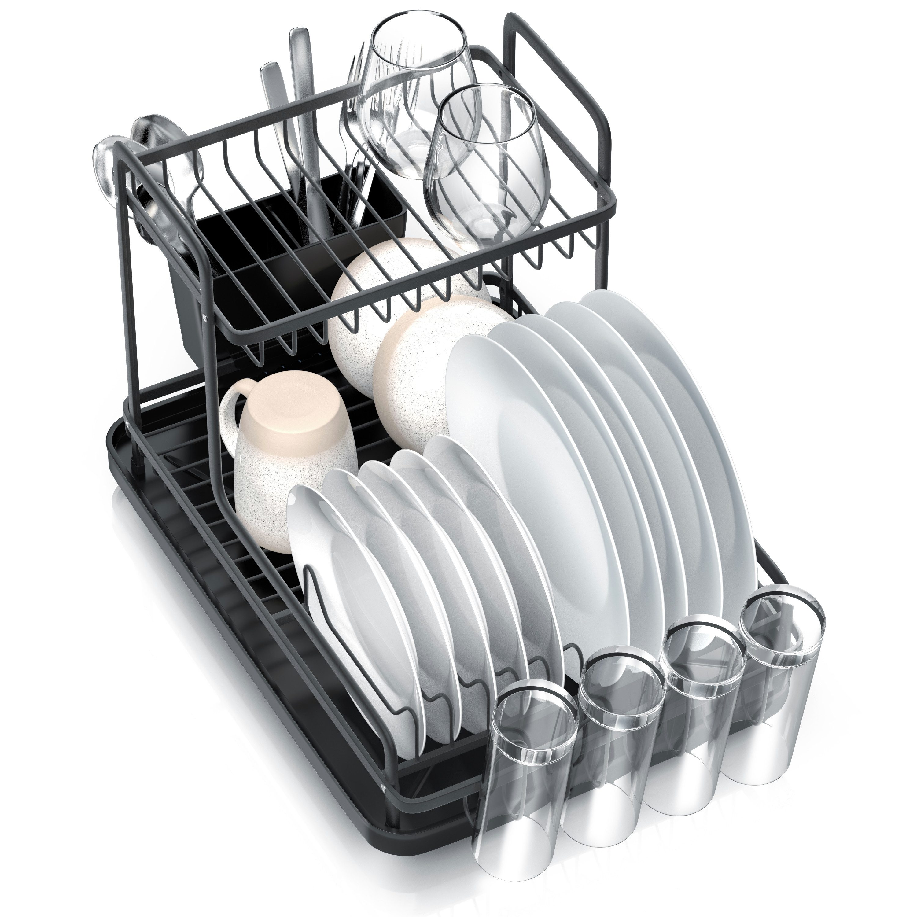 Lieferumfang | zweilagiger Geschirrständer mit integriertem Tassenständer, 360° Abtropfschale, Besteckhalter |