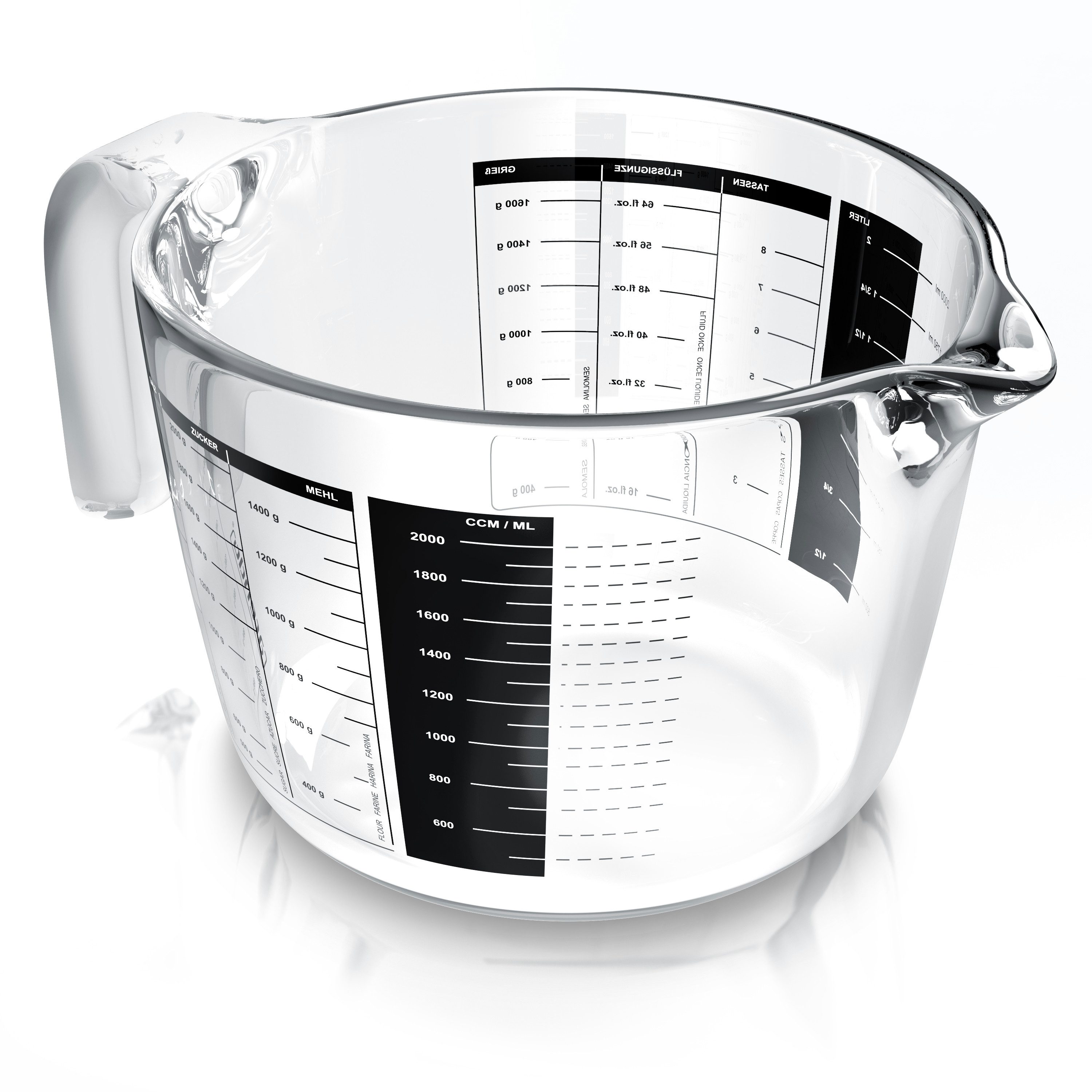 Die vielseitige 8-teilige Skalierung zeigt nicht nur die gängigen Maßeinheiten wie Liter, Milliliter und Fluid Ounces, sondern ermöglicht auch das direkte Ablesen typischer Zutaten wie Zucker, Mehl, Salz, Grieß und Tassen (Cups). So entfällt lästiges Umrechnen und man hat alle wichtigen Maße direkt im Blick. Ideal zum Abmessen von Tassen mit großer Füllmenge (220 ml).
