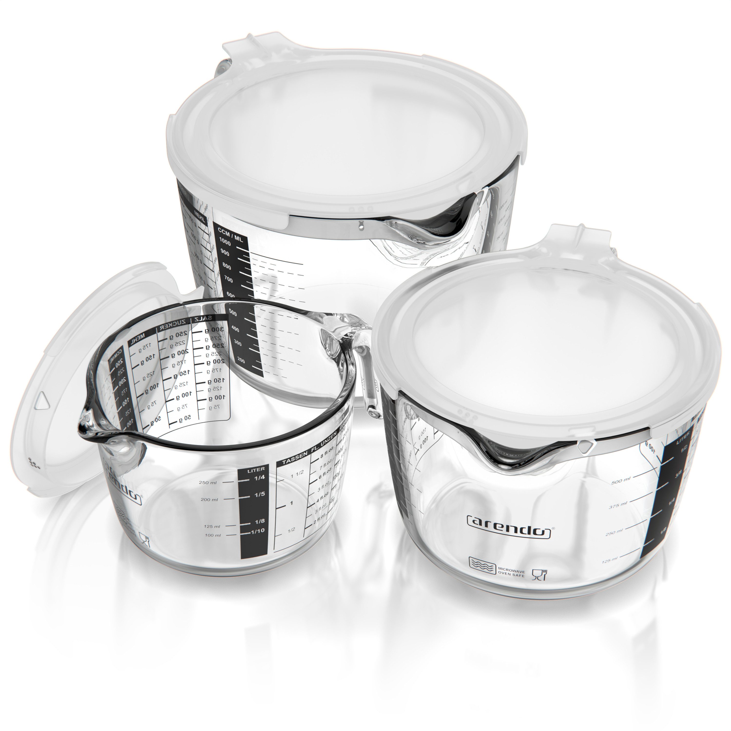 Lieferumfang: 3 x Set Messbecher Borosilikatglas 250, 500 und 1000 ml inkl. transparente Deckel