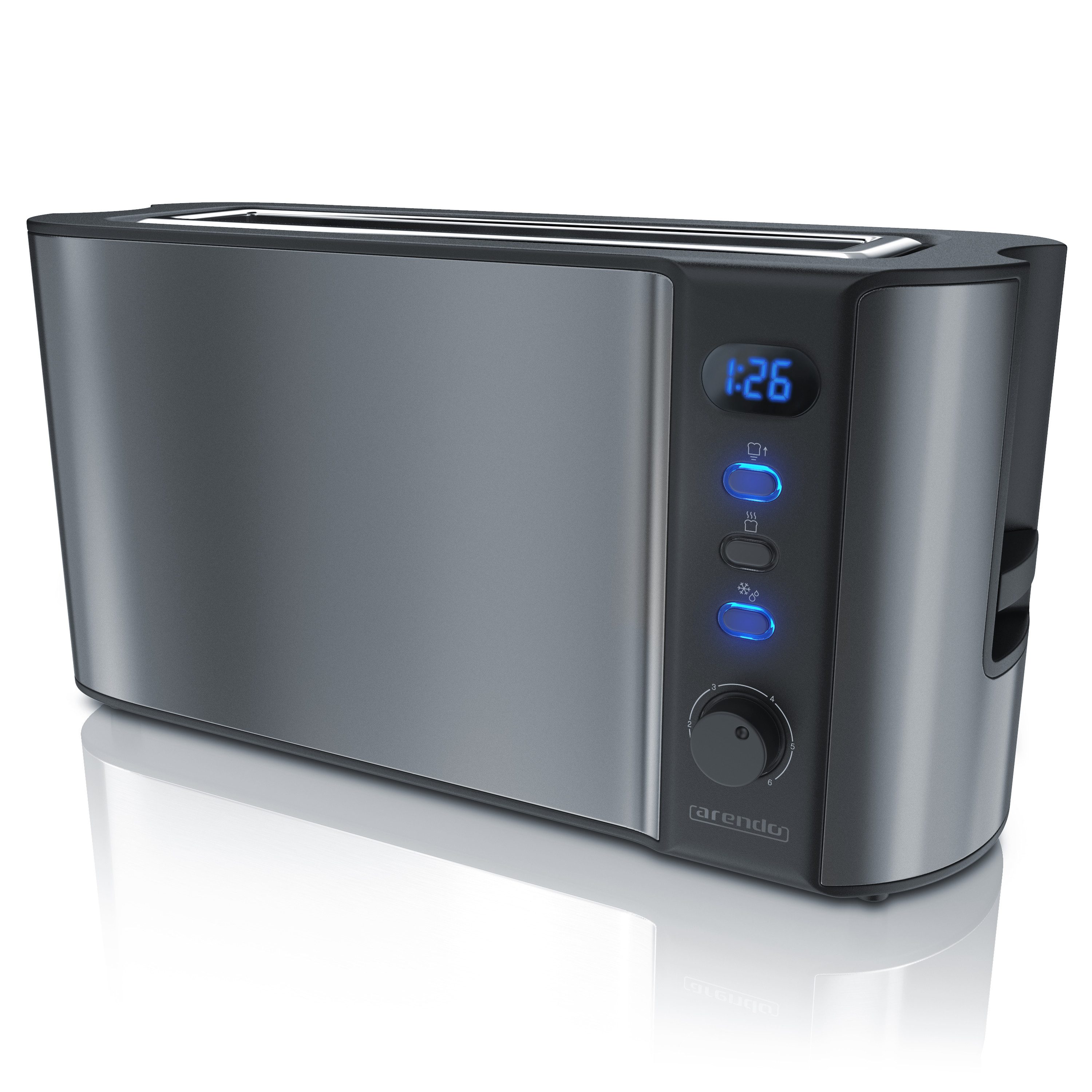 Der elegante Arendo Frukost 2-Scheiben Langschlitz-Toaster im coolen Edelstahl-Design mit einem wärmeisolierenden Doppelwandgehäuse überzeugt auf ganzer Linie. Ob Baguettes, Bagels, Brötchen, Croissants, große oder dicke/dünne Brotscheiben oder ein klassisches Sandwich-Toast - der hochwertige Edelstahl-Toaster von Arendo bräunt stets optimal.